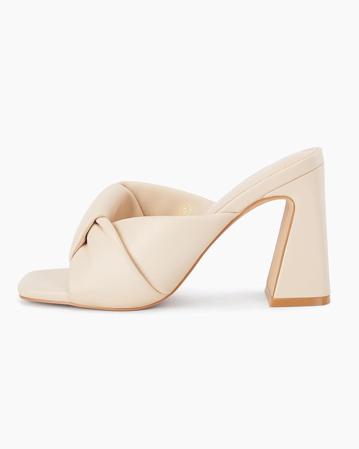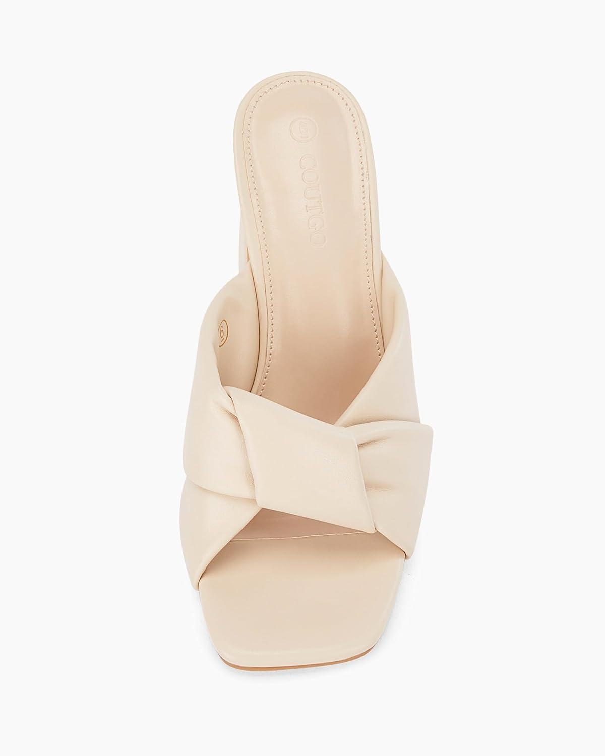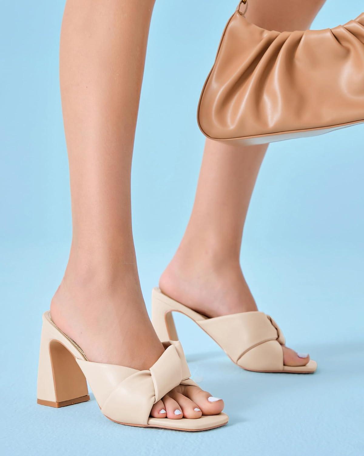 Coutgo Womens Chunky Heeled Mules Puffy Knot Square Open Toe Slip On Sandals Summer Evening Party Prom Shoes(Apricot)