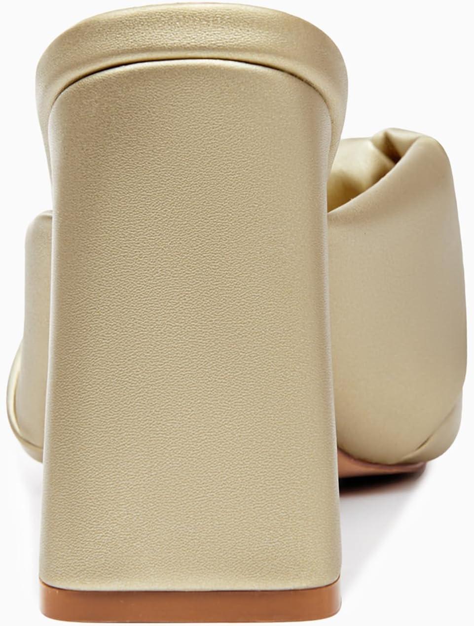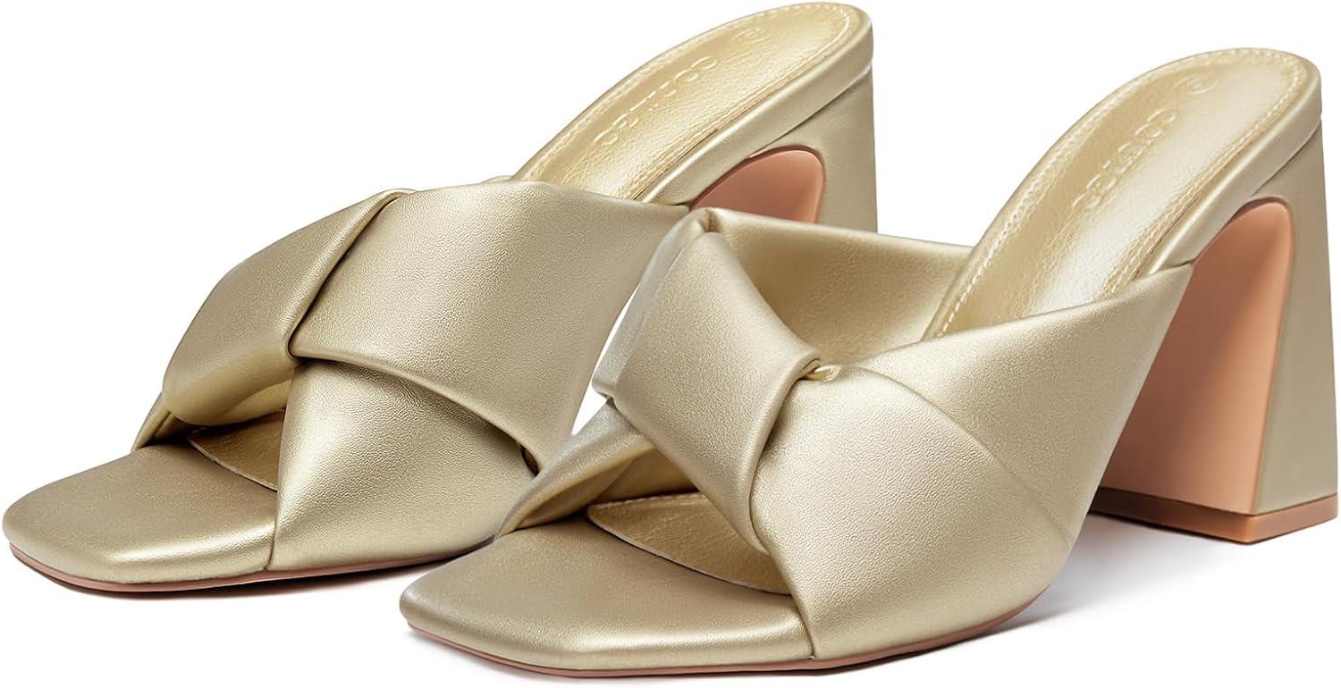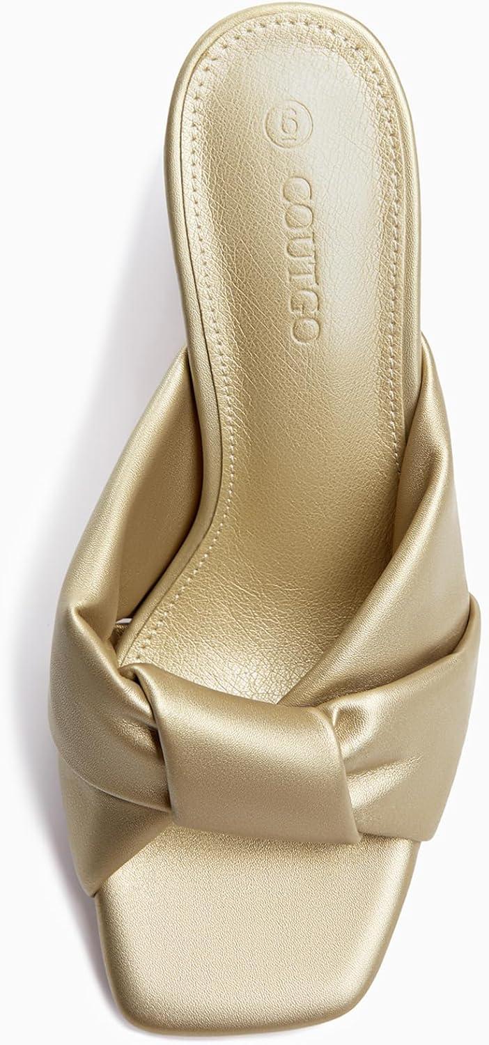 Coutgo Womens Chunky Heeled Mules Puffy Knot Square Open Toe Slip On Sandals Summer Evening Party Prom Shoes(Gold)