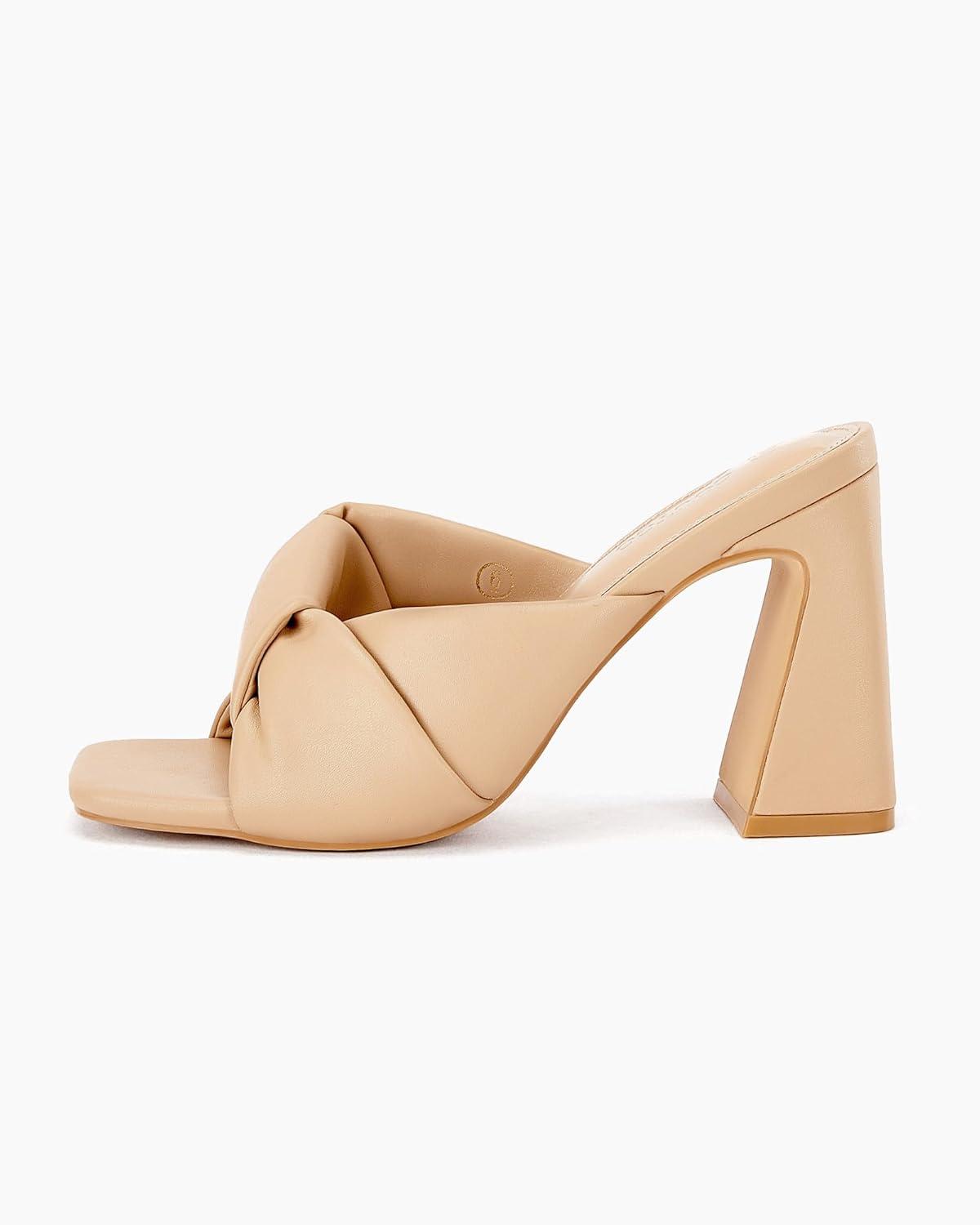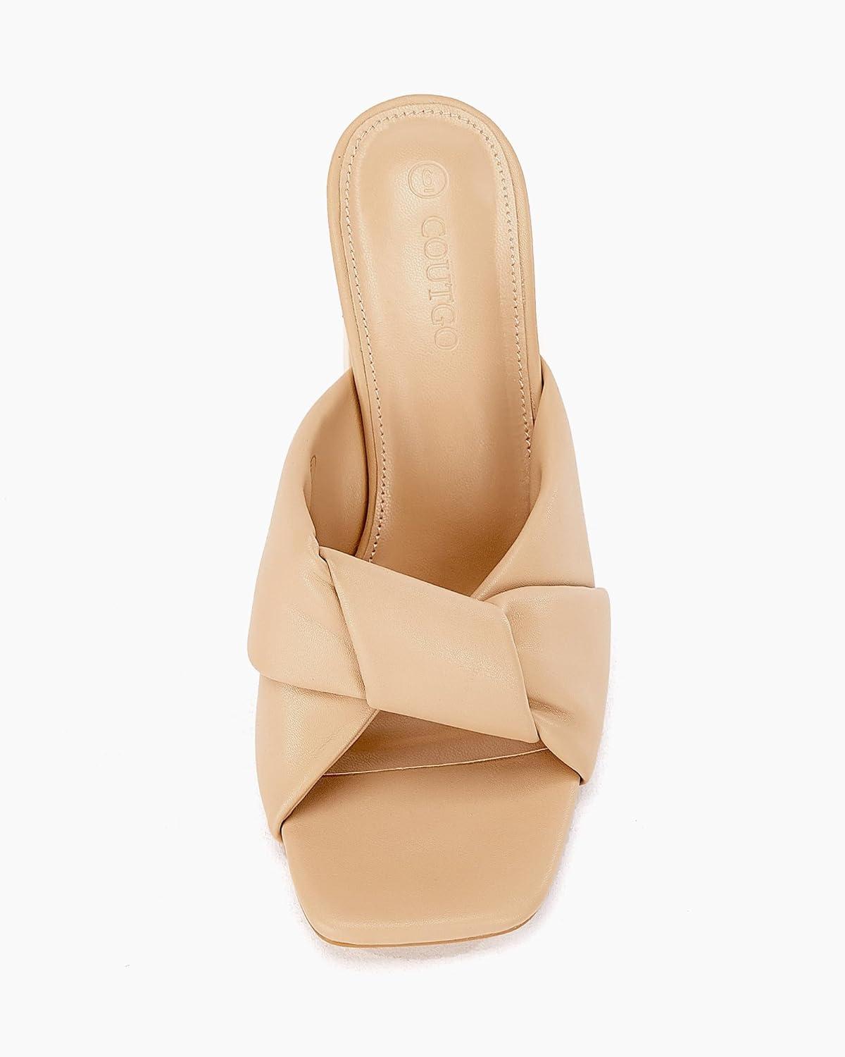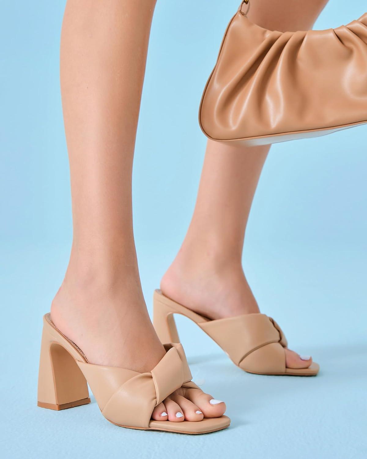 Coutgo Womens Chunky Heeled Mules Puffy Knot Square Open Toe Slip On Sandals Summer Evening Party Prom Shoes(Khaki)