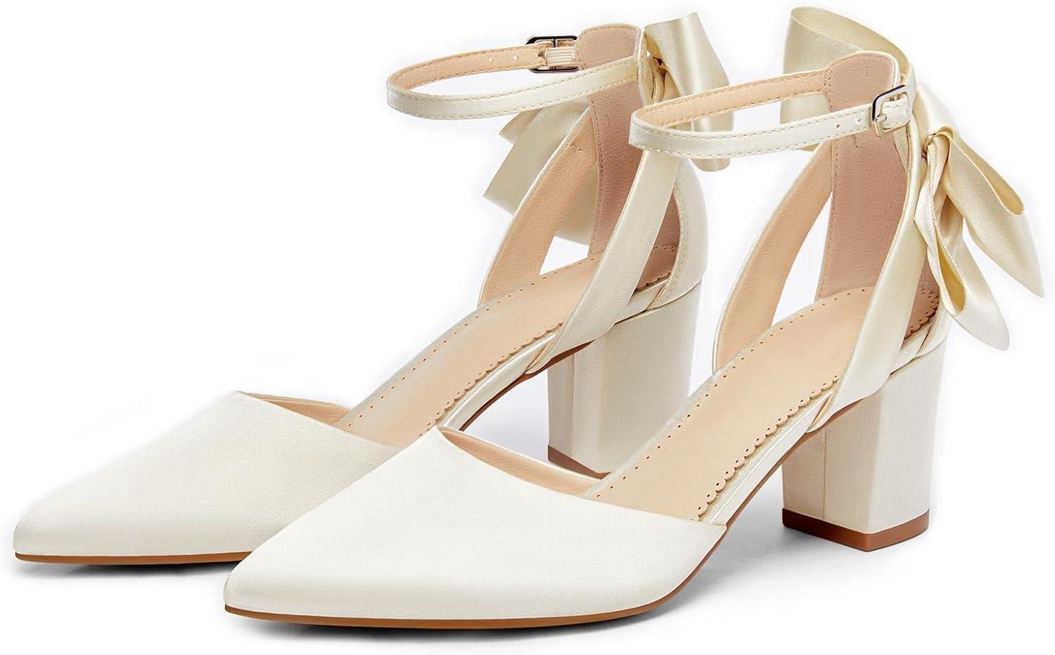 Coutgo Womens Chunky Heels Low Heel Ankle Strap D’Orsay Pumps Closed Pointed Toe Wedding Bridal Shoes(Beige)