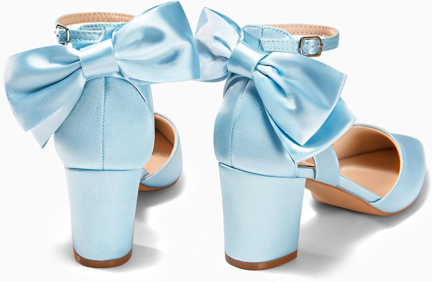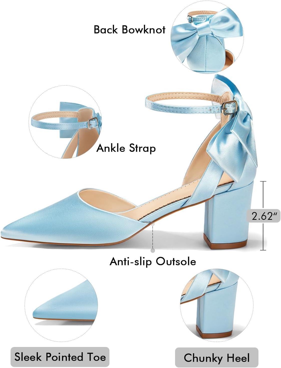 Coutgo Womens Chunky Heels Low Heel Ankle Strap D’Orsay Pumps Closed Pointed Toe Wedding Bridal Shoes(Light Blue)