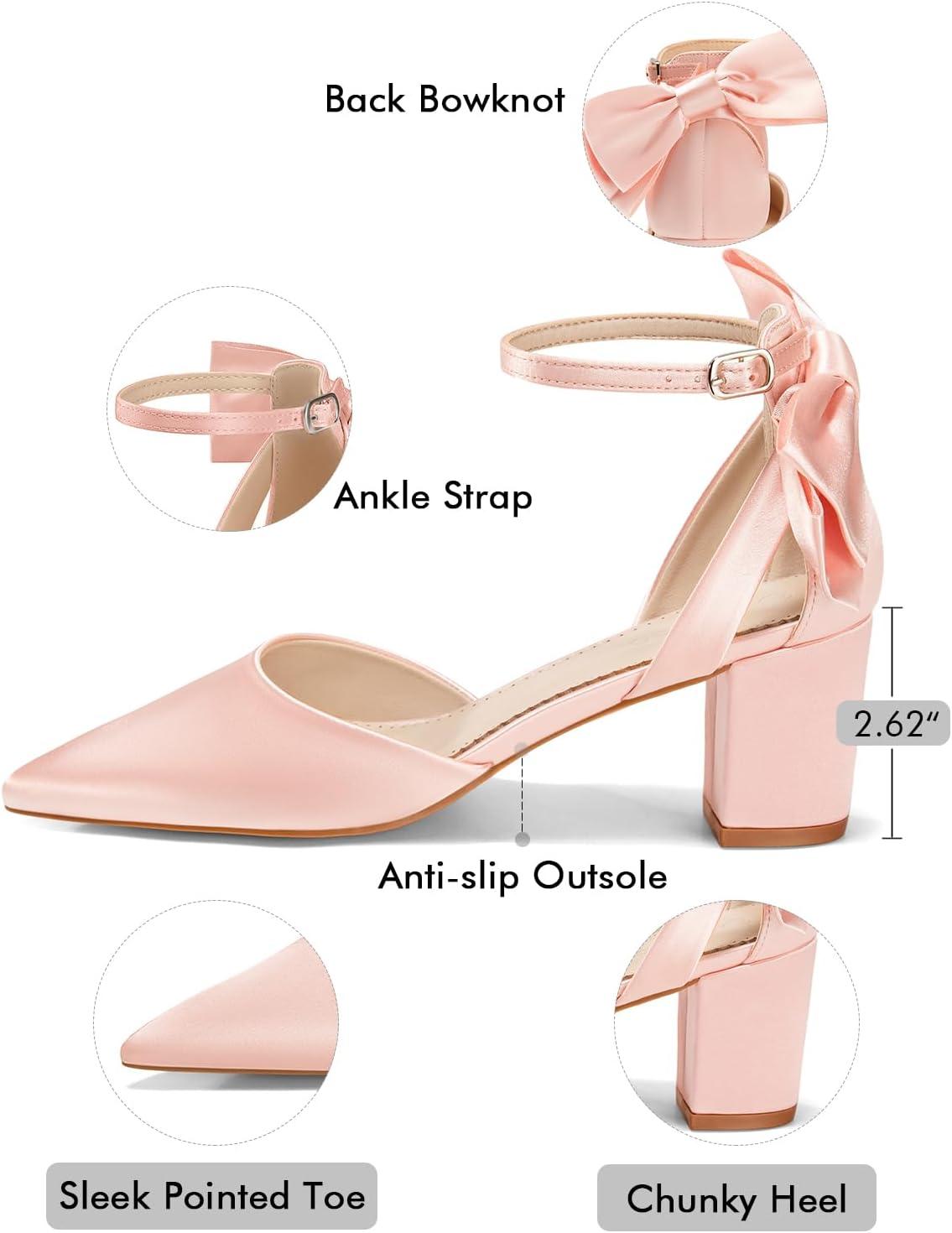 Coutgo Womens Chunky Heels Low Heel Ankle Strap D’Orsay Pumps Closed Pointed Toe Wedding Bridal Shoes(Pink-)
