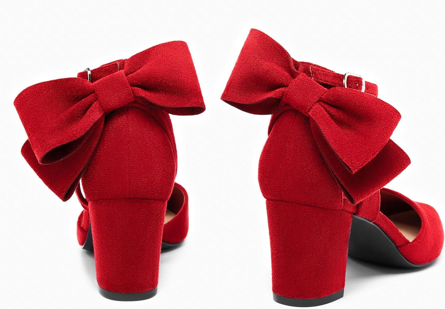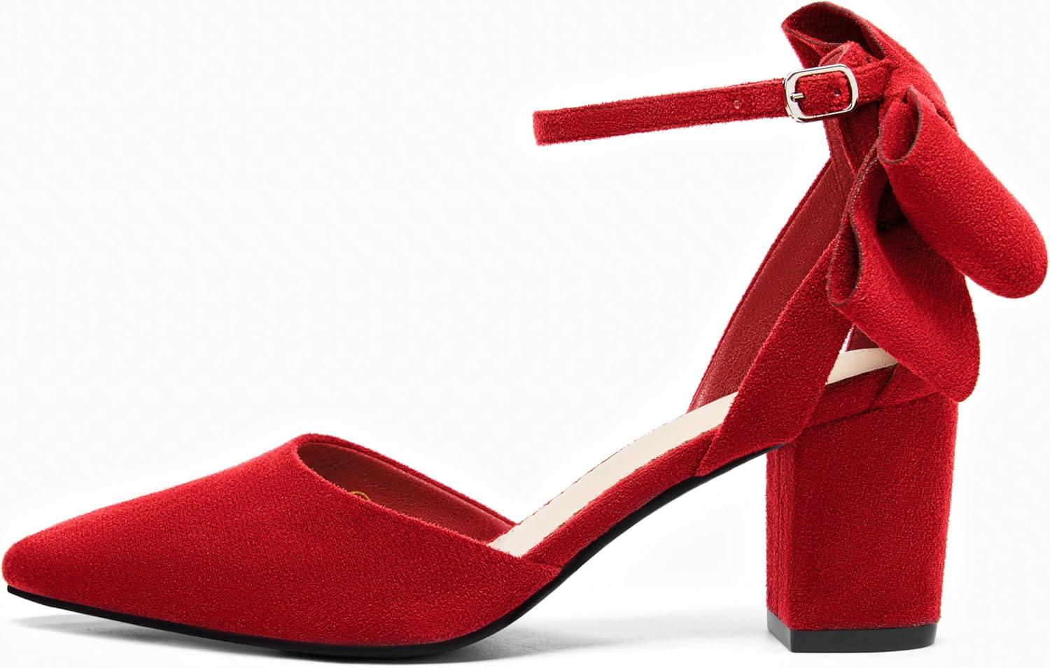 Coutgo Womens Chunky Heels Low Heel Ankle Strap D’Orsay Pumps Closed Pointed Toe Wedding Bridal Shoes(Red)