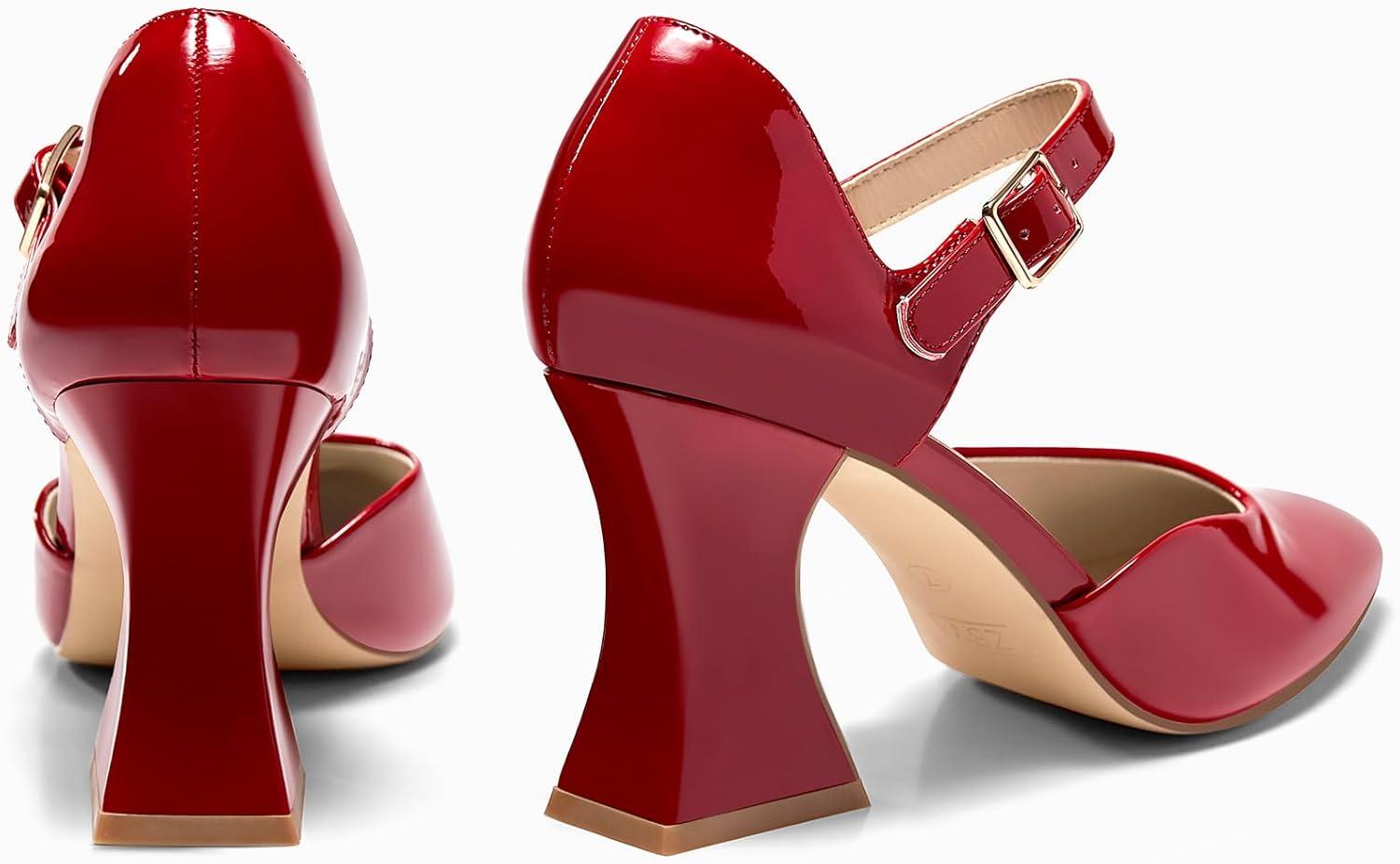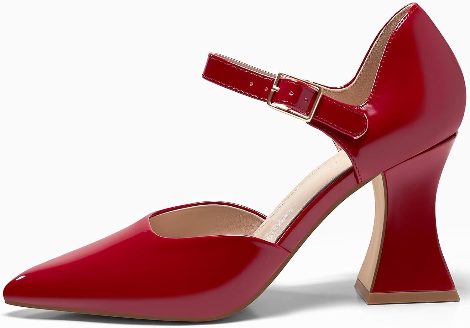 Coutgo Womens Chunky High Heels Closed Pointed Toe Ankle Strap Pumps Cute Dress Dance Shoes(Red)