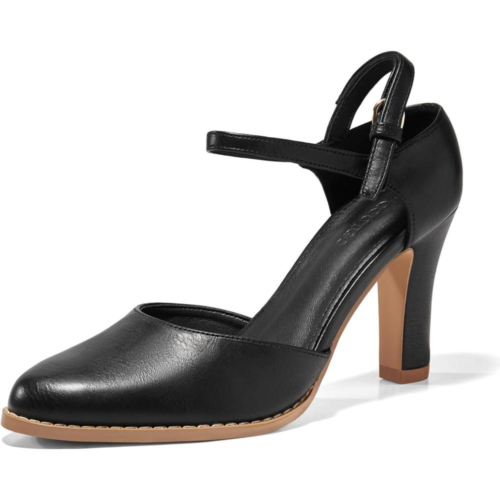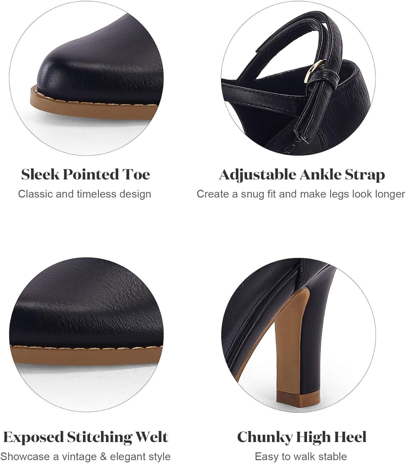 Coutgo Womens Chunky High Heels Closed Pointed Toe Ankle Strap Pumps Vintage D’Orsay Dress Party Shoes(Black)