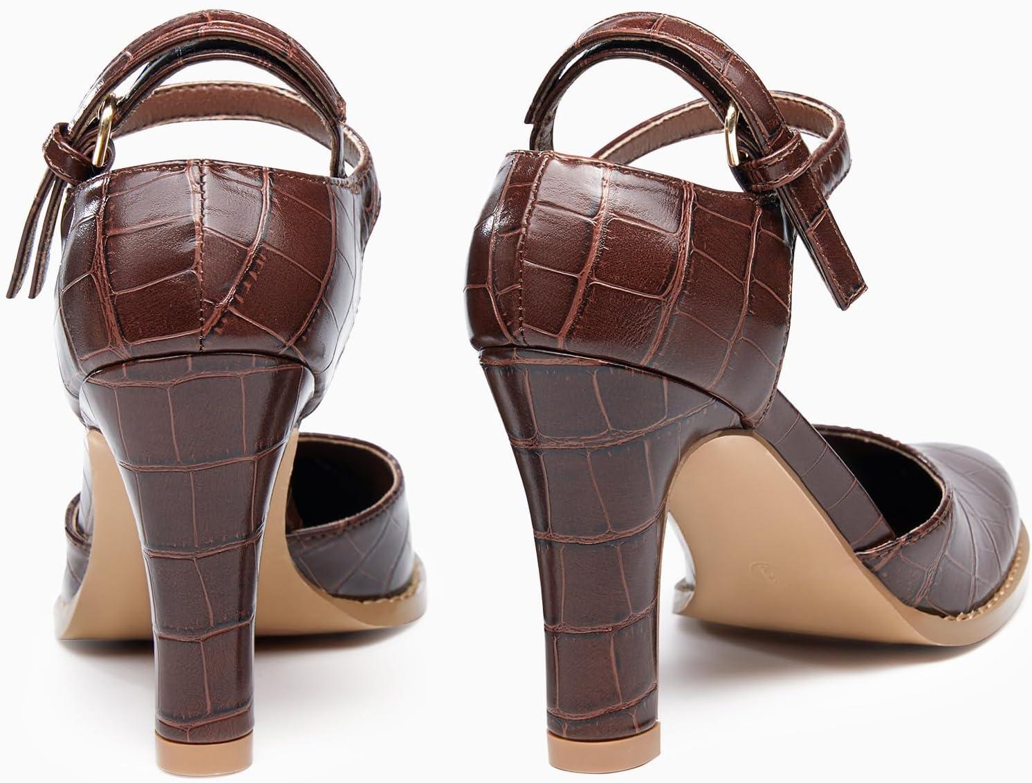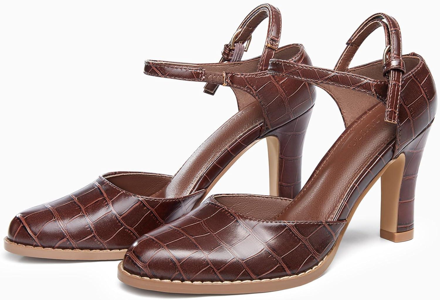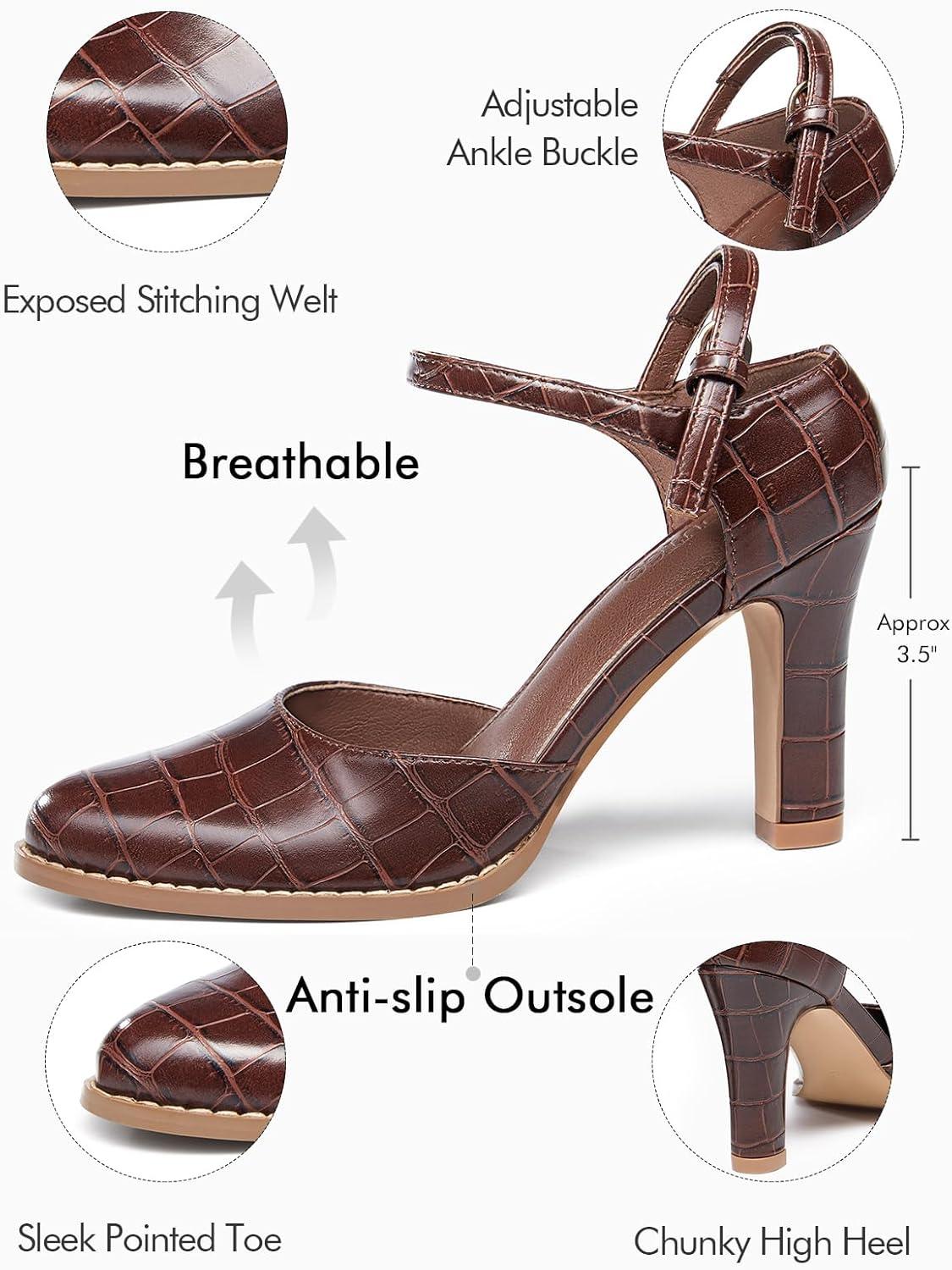Coutgo Womens Chunky High Heels Closed Pointed Toe Ankle Strap Pumps Vintage D’Orsay Dress Party Shoes(Coffee)