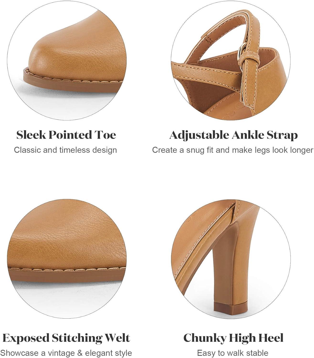 Coutgo Womens Chunky High Heels Closed Pointed Toe Ankle Strap Pumps Vintage D’Orsay Dress Party Shoes(Light Brown)