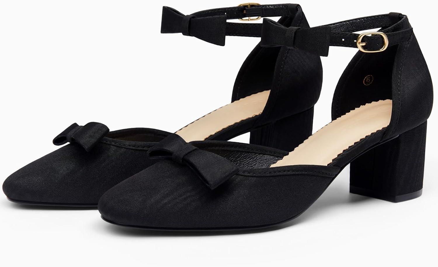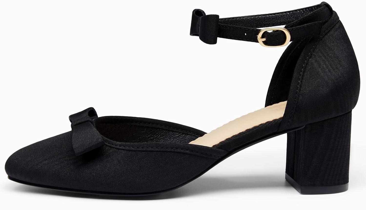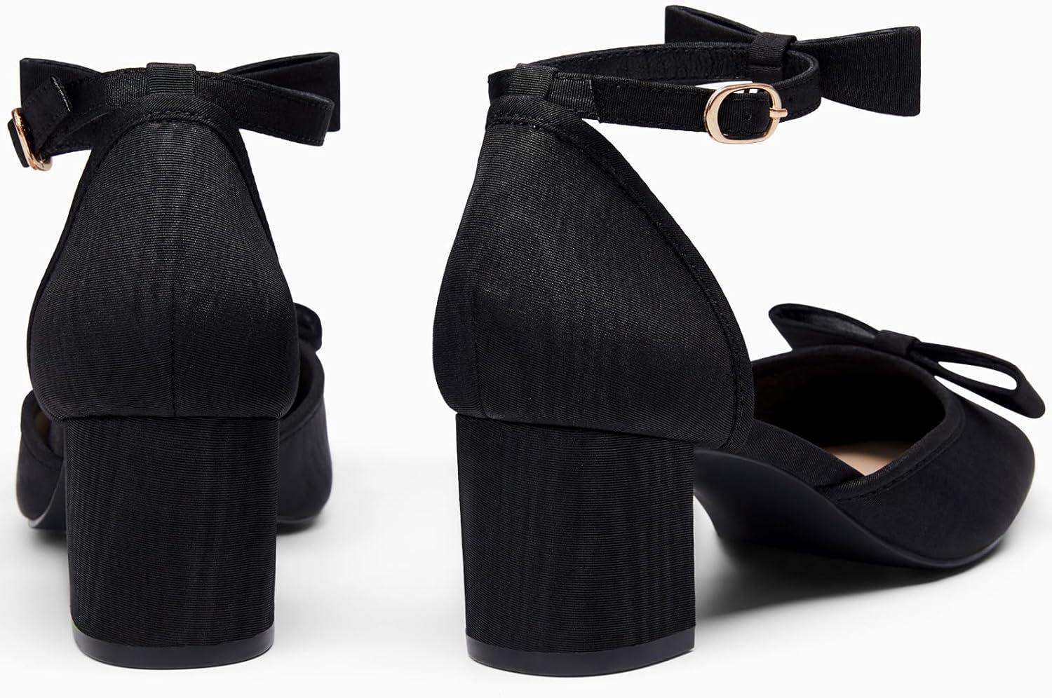 Coutgo Womens Chunky Low Heels Bow Closed Toe Ankle Strap Pumps Elegant Wedding Party Dress Shoes(Cool Black)