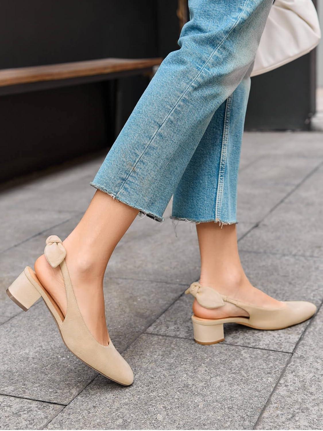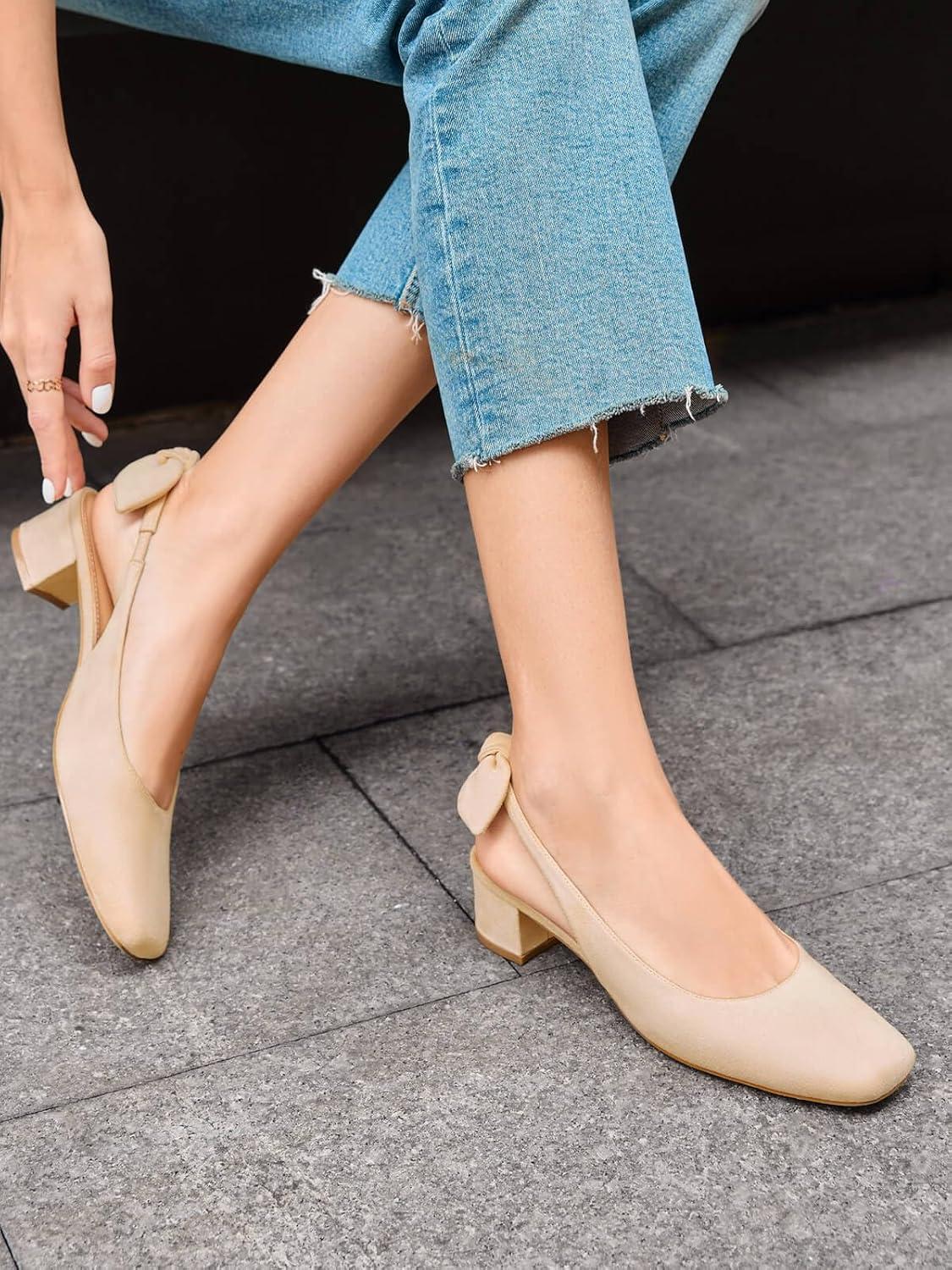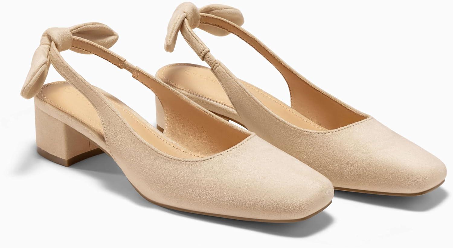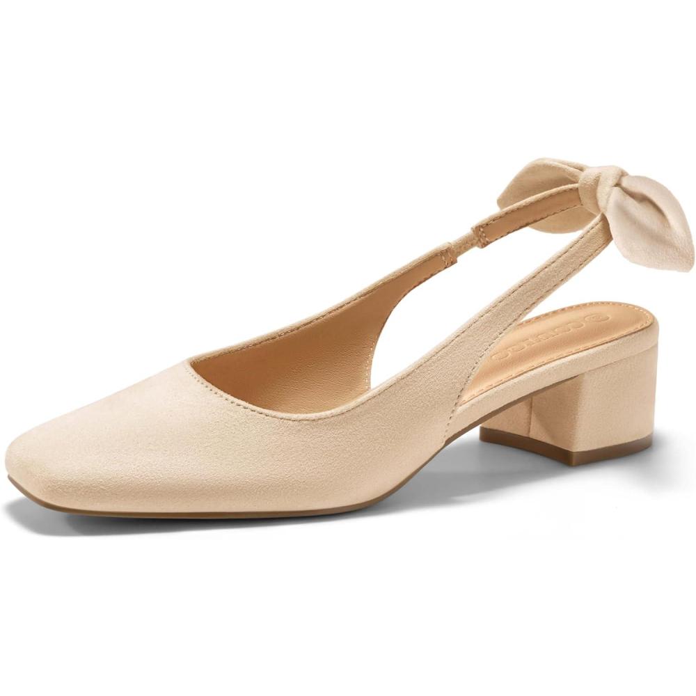 Coutgo Womens Chunky Low Heels Bow Slingback Pumps Closed Square Toe Wedding Party Dress Shoes(Apricot)