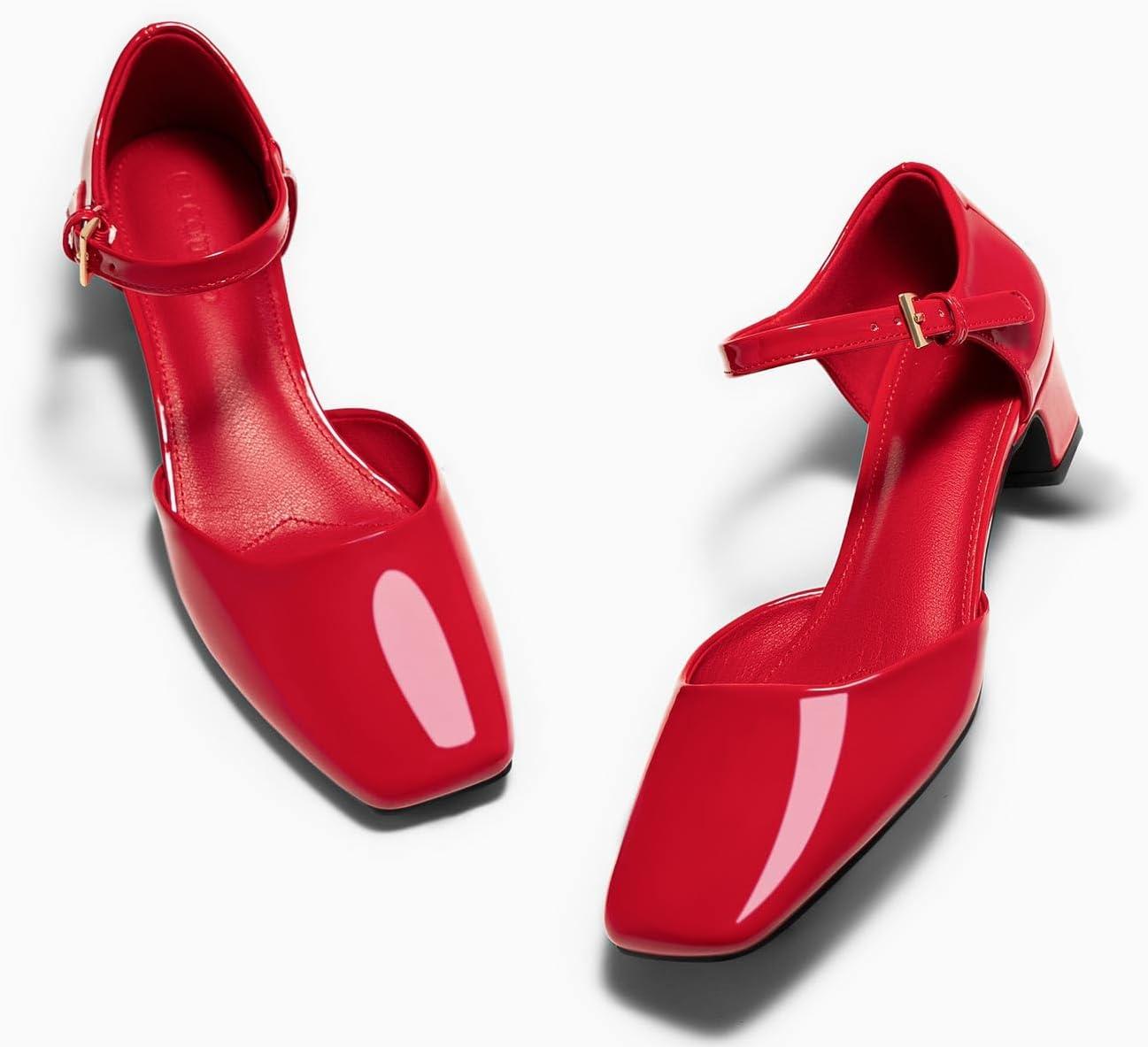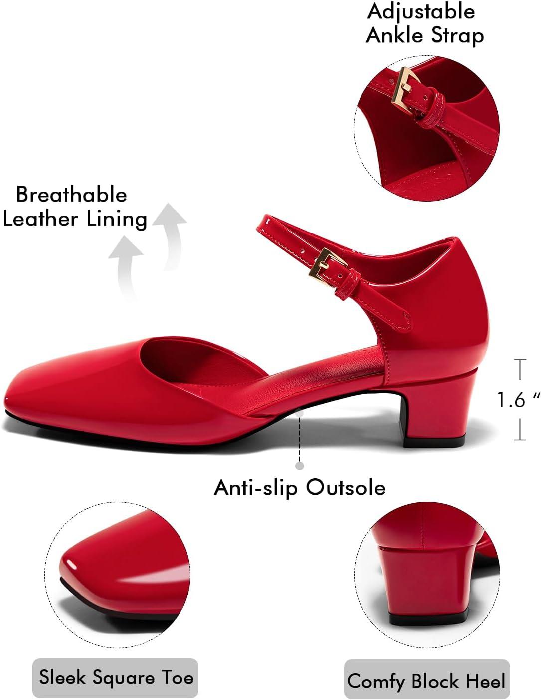 Coutgo Womens Chunky Low Heels Dress Shoes Ankle Buckle Strap Square Toe D’Orsay Pumps Work Party Shoes(Red)