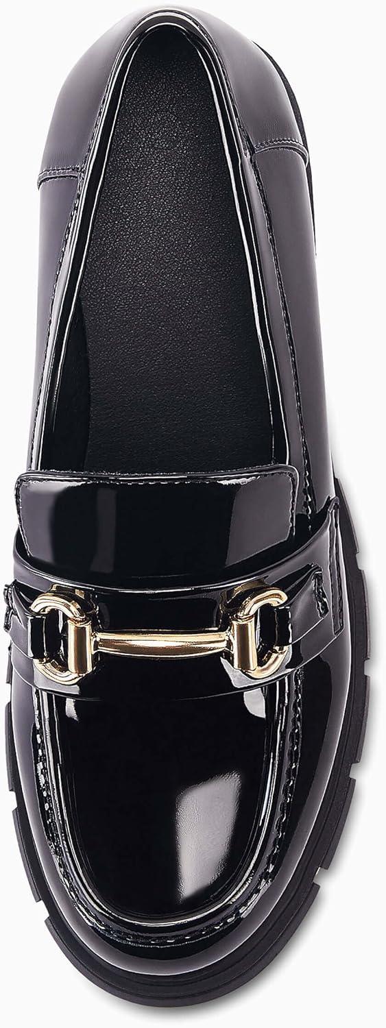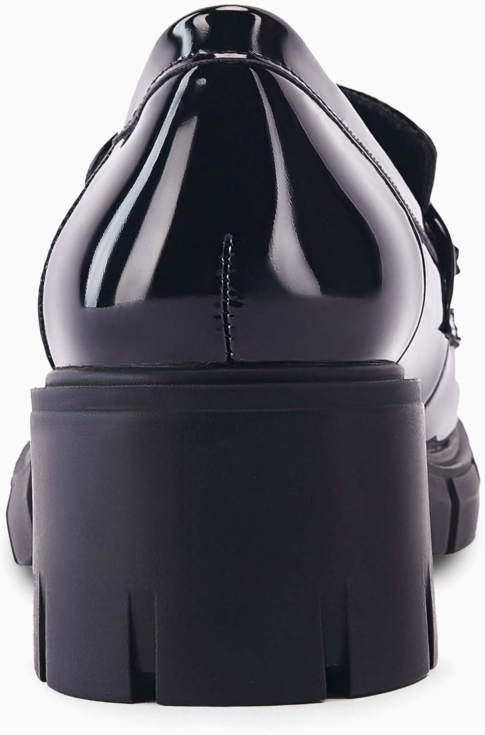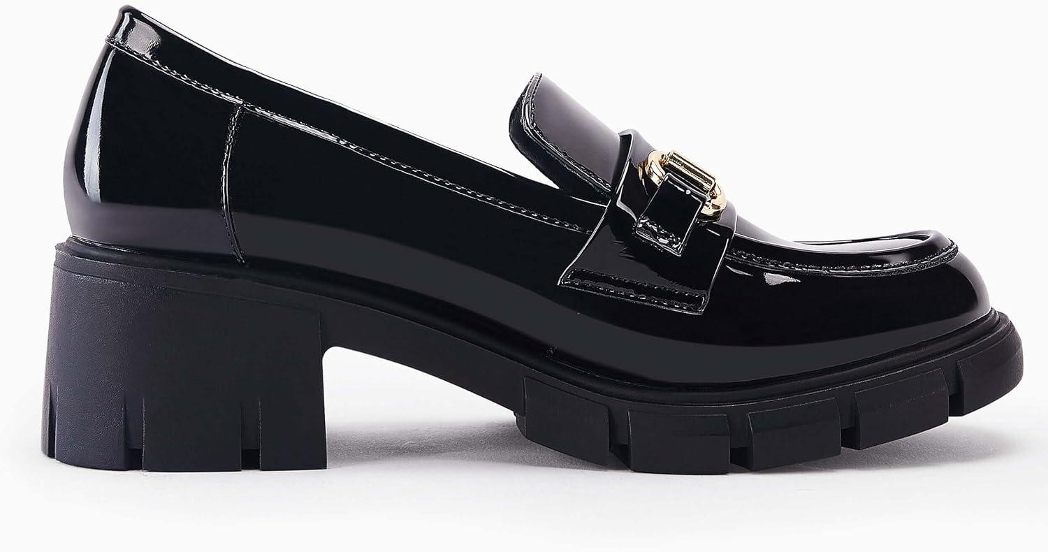 Coutgo Womens Chunky Platform Lug Sole Loafers Mid Heel Square Toe Dress Walking Work Shoes with Buckle Chain(Mirror Leather Black)