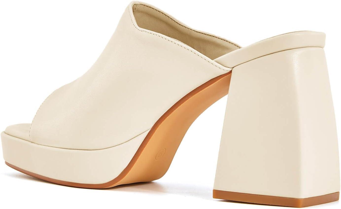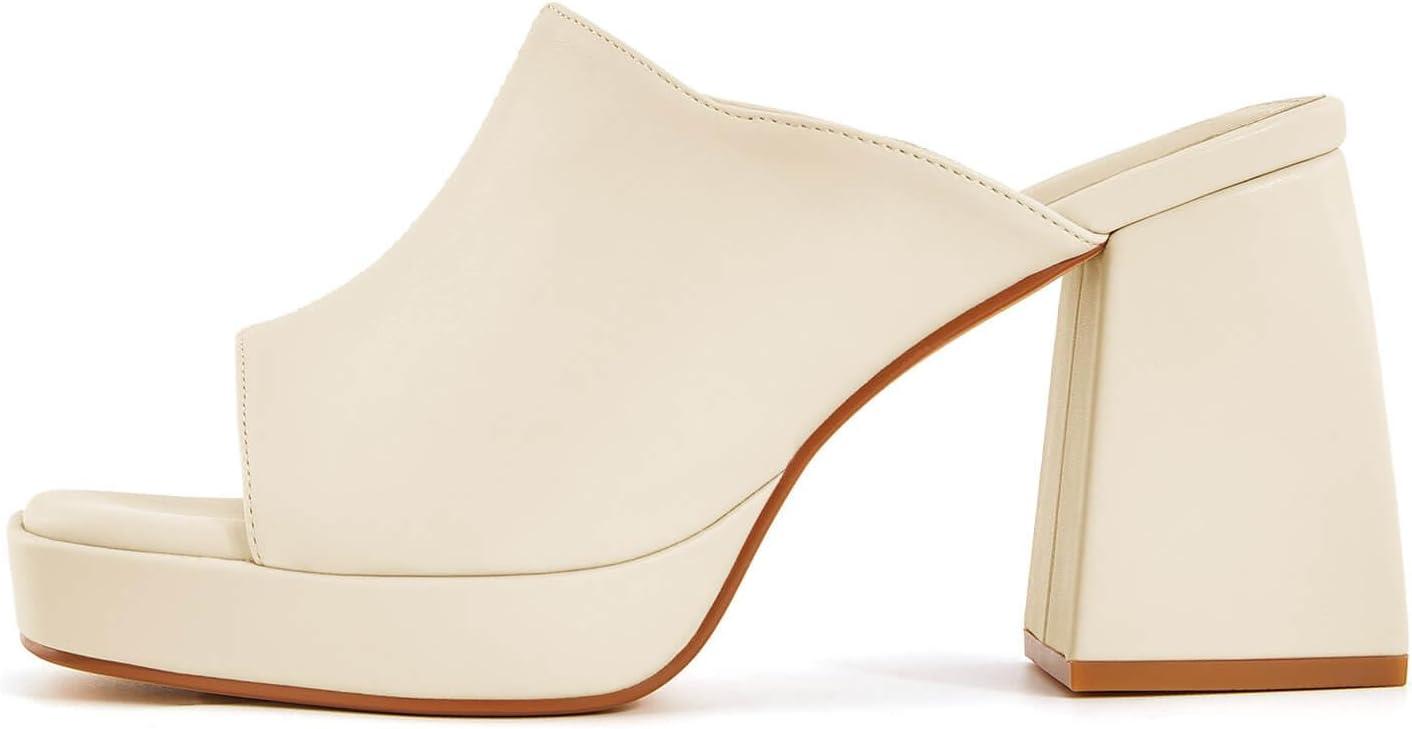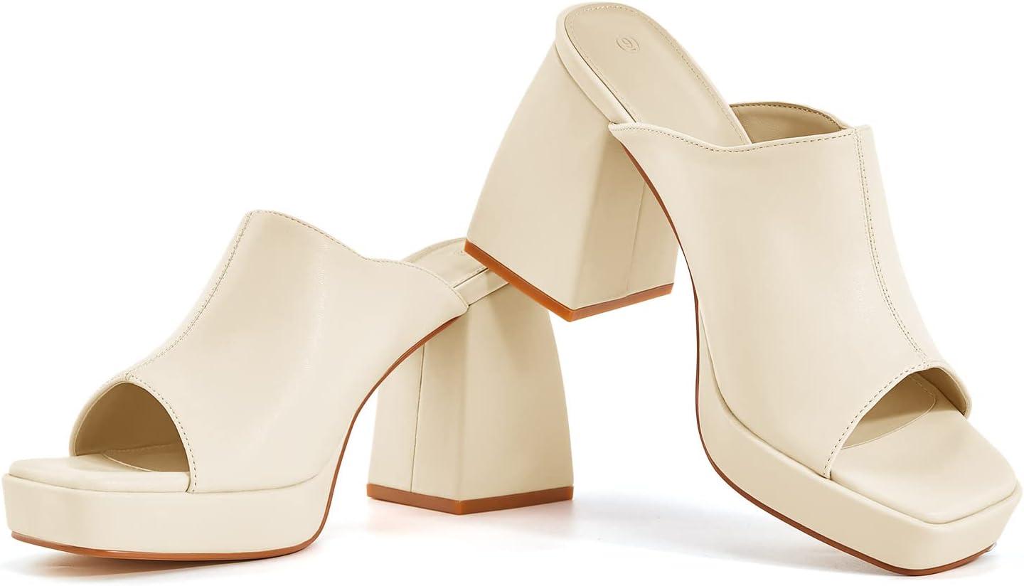 Coutgo Womens Chunky Platform Mules Sandals Slip On Block Heels Square Toe High Heeled Dress Shoes(Beige)