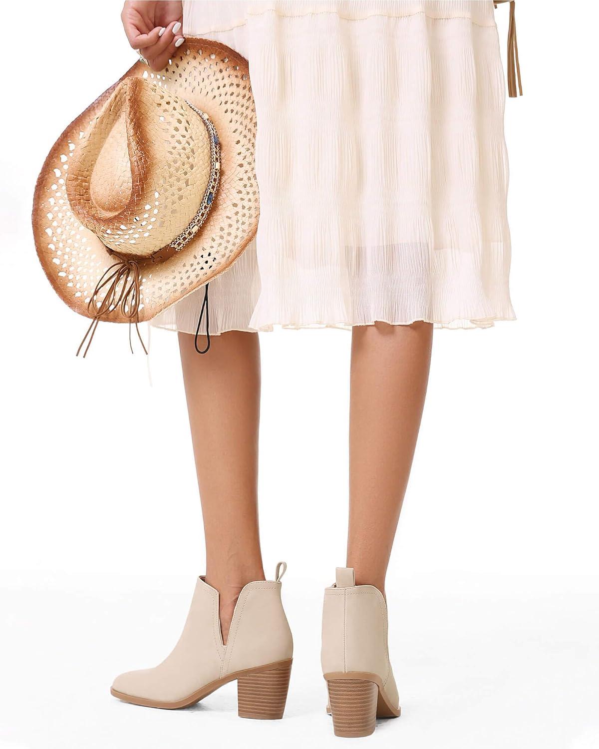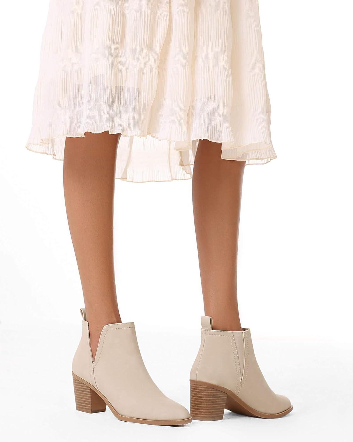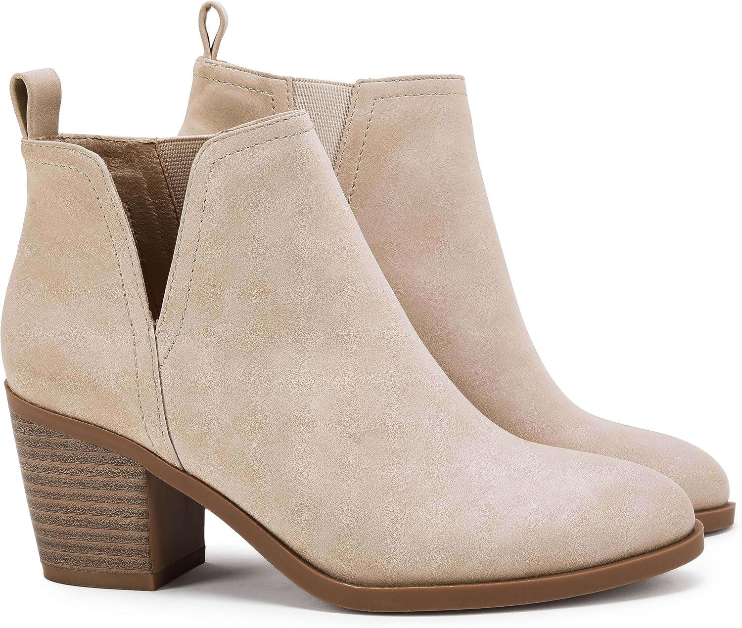 Coutgo Womens Cut Out Ankle Boots Chunky Stacked Heel Almond Toe Slip on Western Booties(Khaki)
