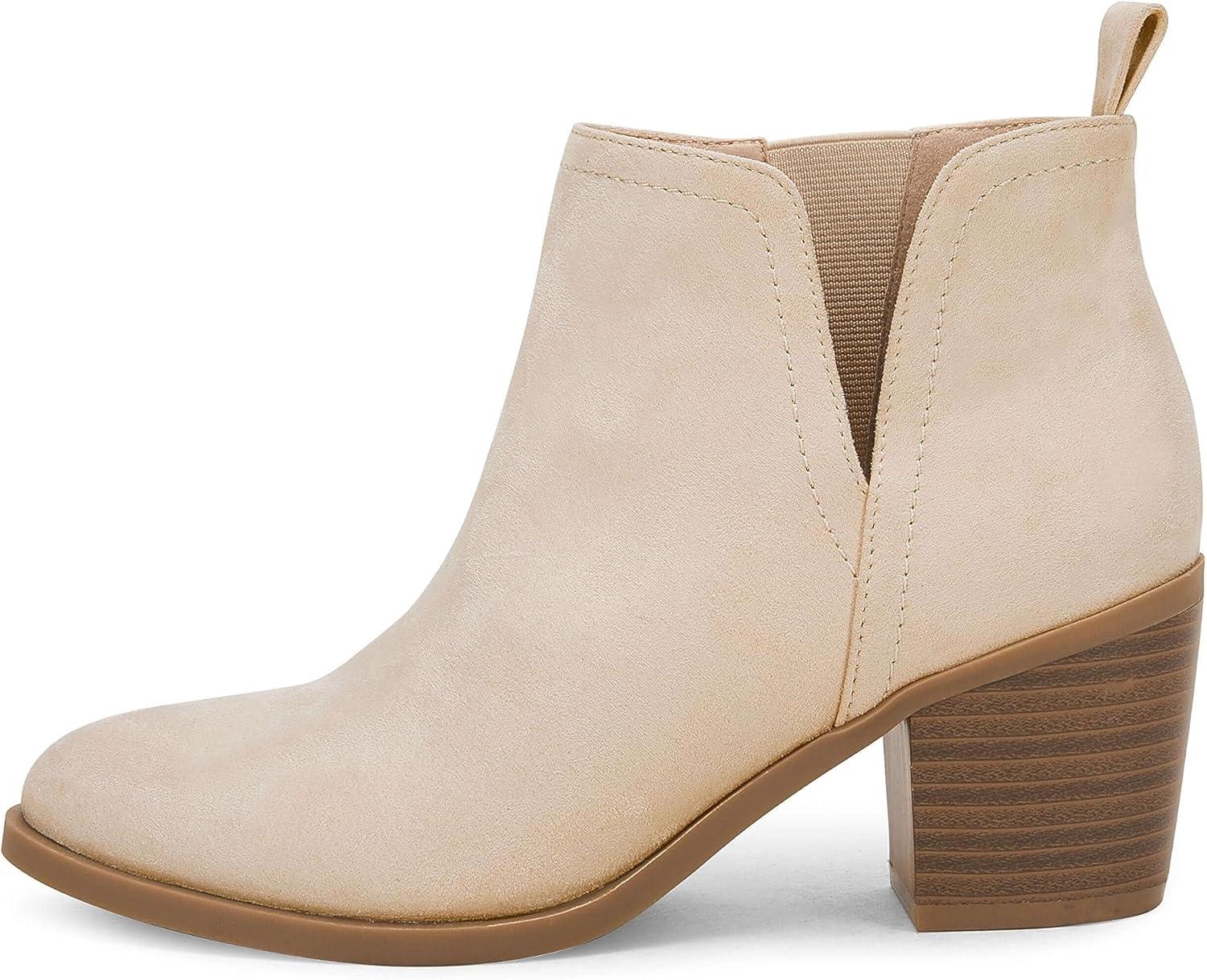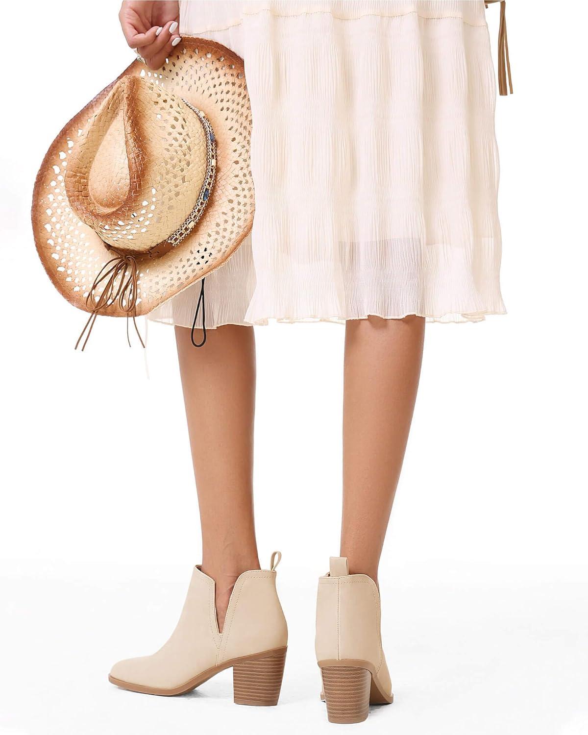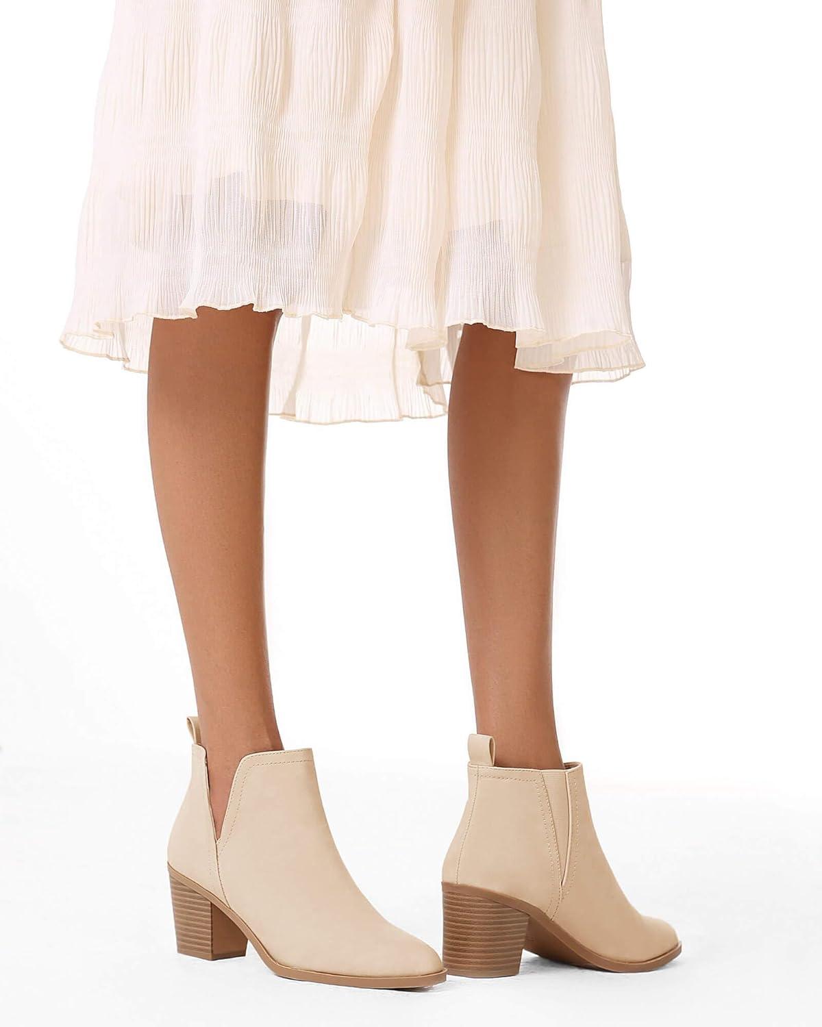Coutgo Womens Cut Out Ankle Boots Chunky Stacked Heel Almond Toe Slip on Western Booties(Nude)