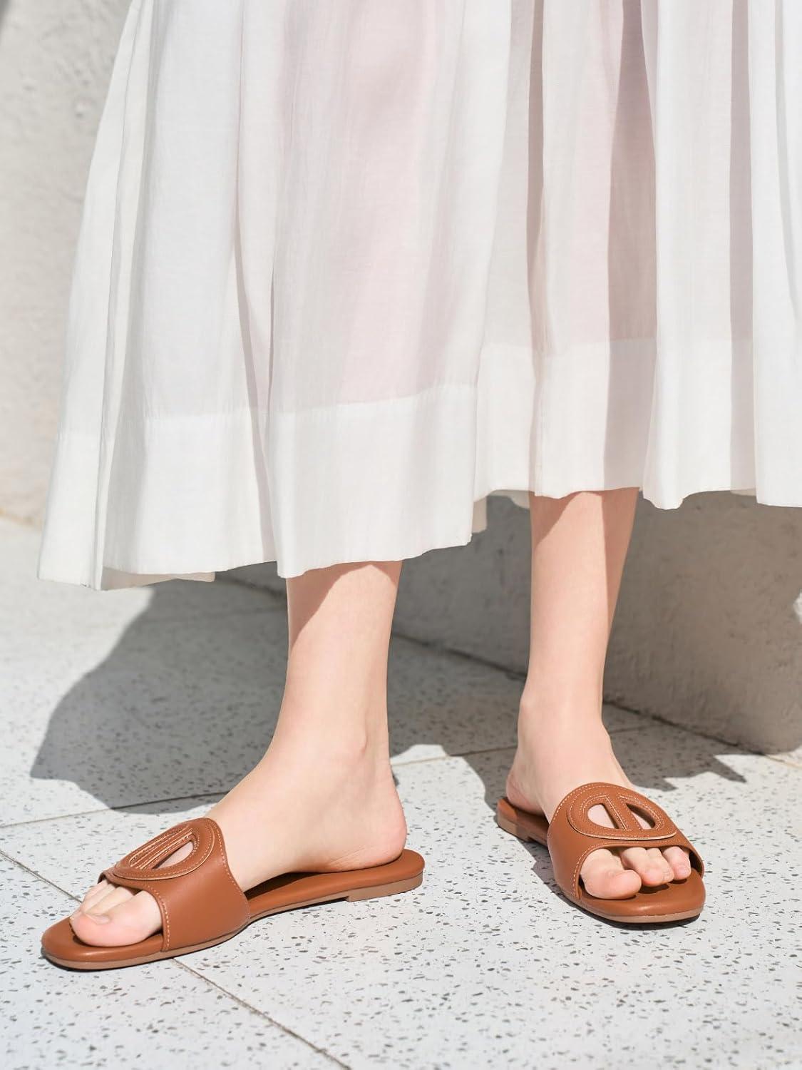Coutgo Womens Dressy Flat Sandals Open Toe Slip on Leather Summer Beach Slide Sandals(Brown)