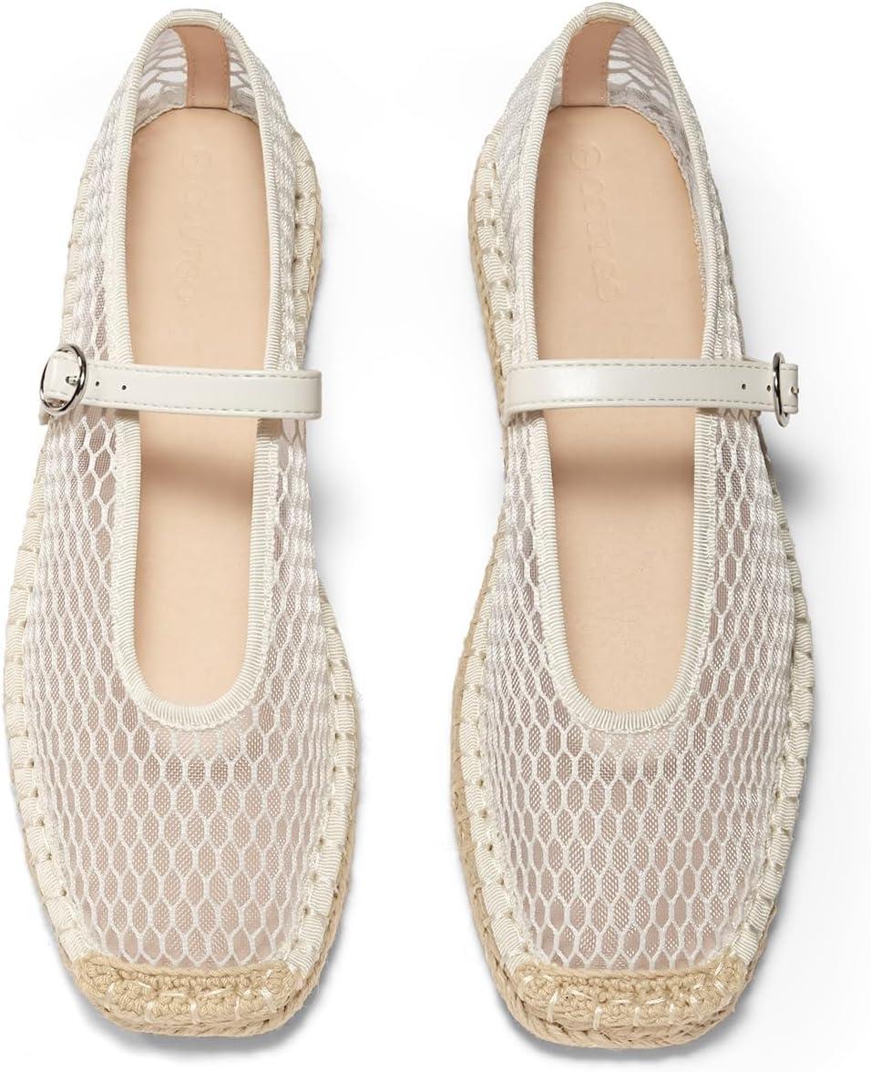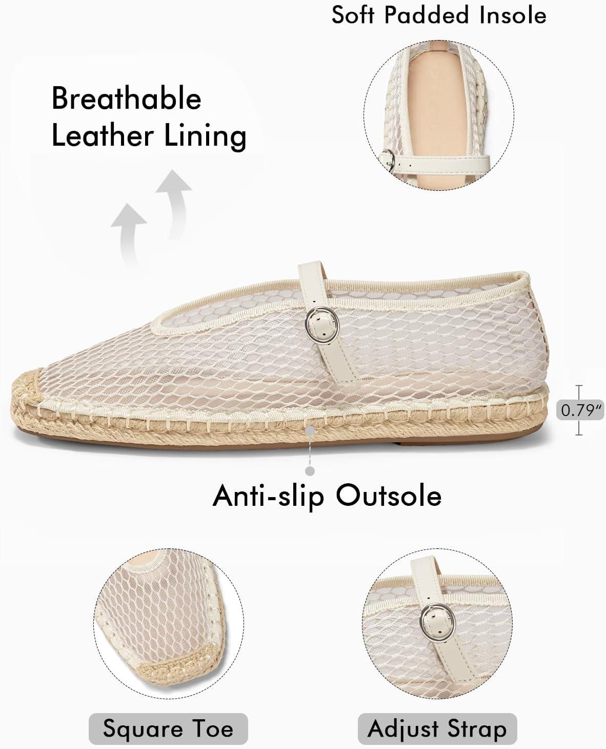 Coutgo Womens Espadrilles Mary Jane Flats Closed Sqaure Toe Mesh Ballet Flats Comfortable Dress Shoes(Beige/Mesh)