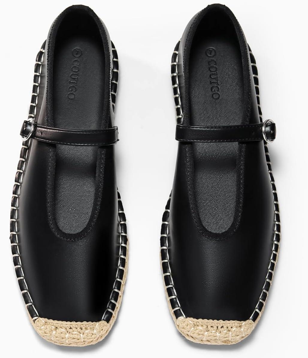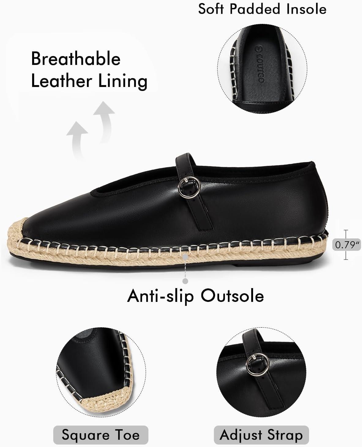 Coutgo Womens Espadrilles Mary Jane Flats Closed Sqaure Toe Mesh Ballet Flats Comfortable Dress Shoes(Black/Pu)