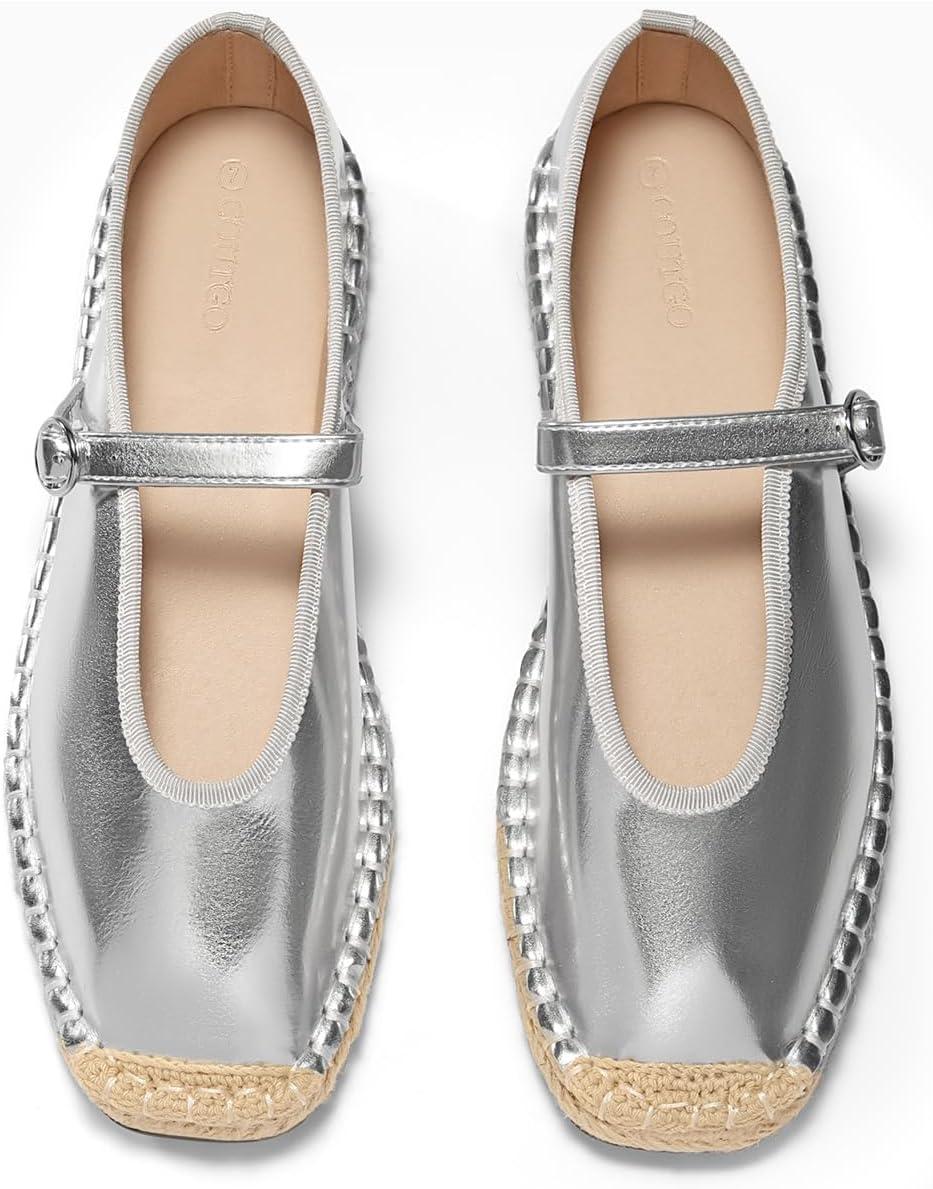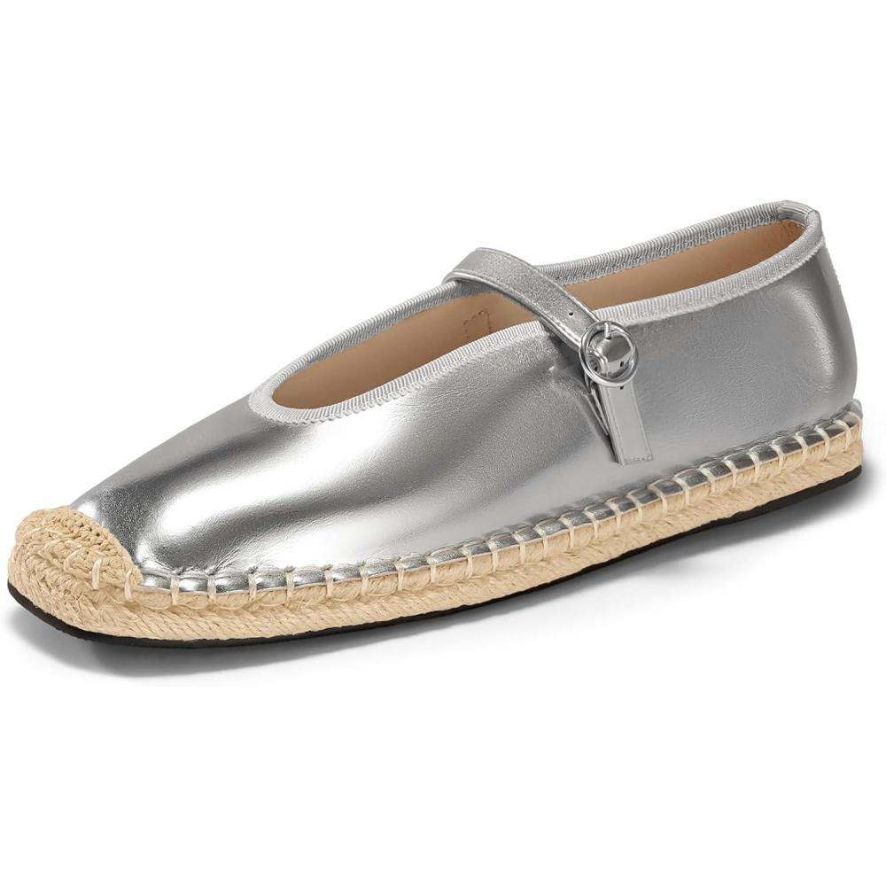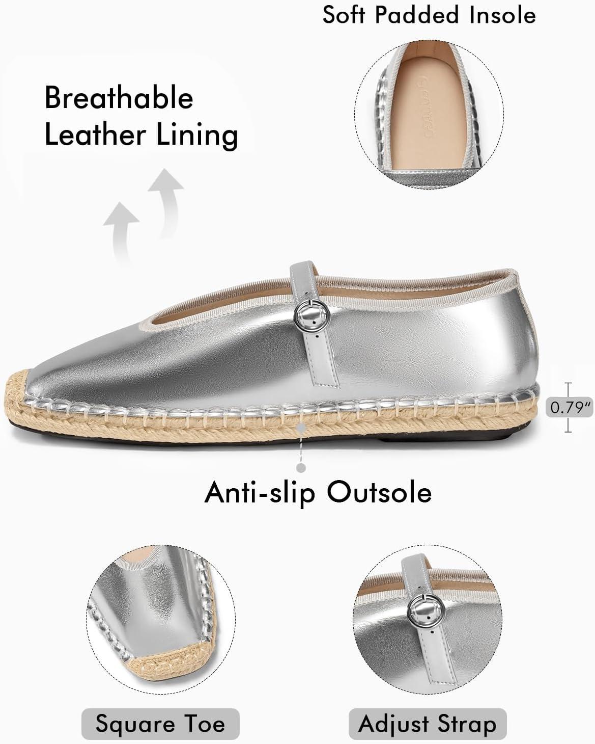 Coutgo Womens Espadrilles Mary Jane Flats Closed Sqaure Toe Mesh Ballet Flats Comfortable Dress Shoes(Silver/Pu)