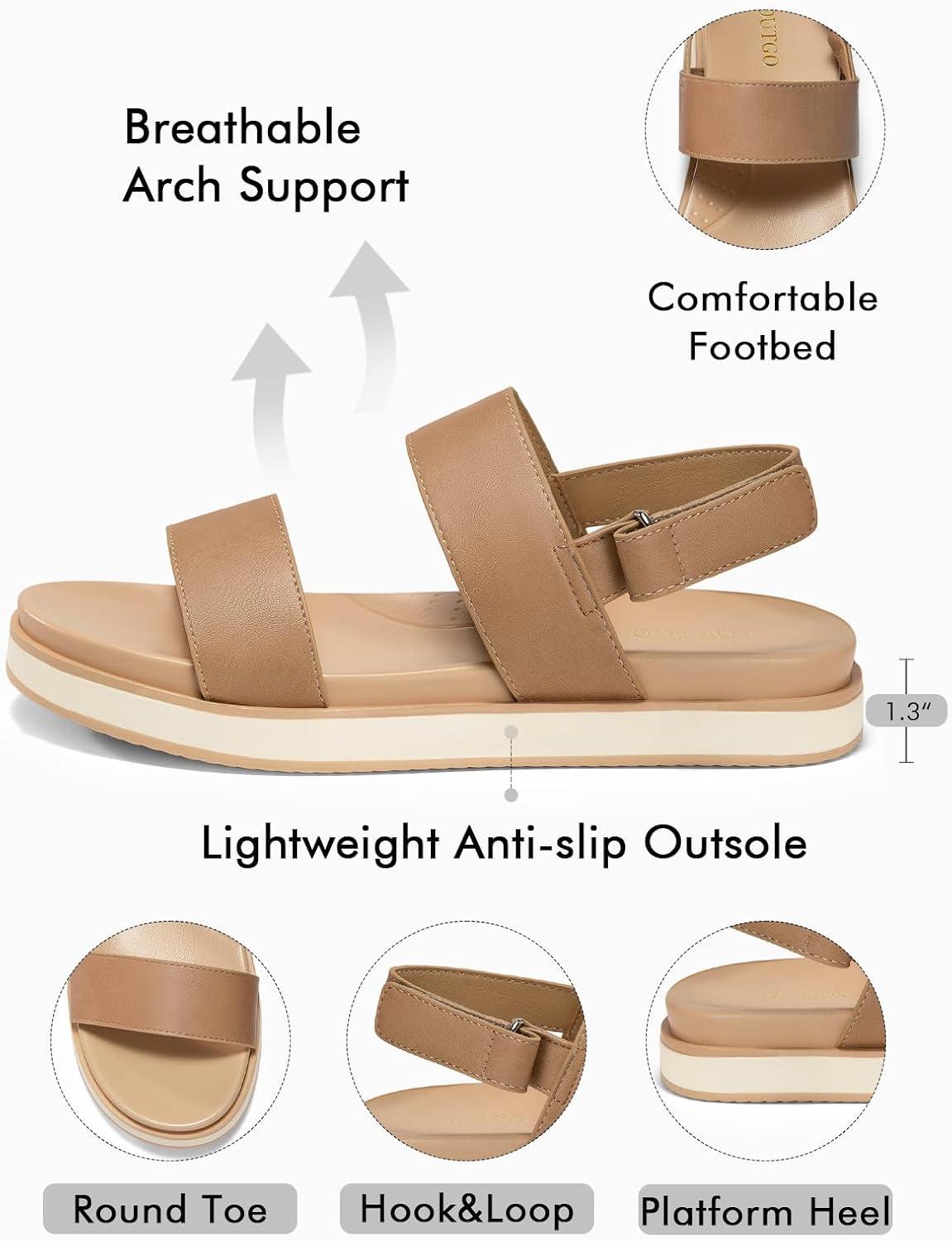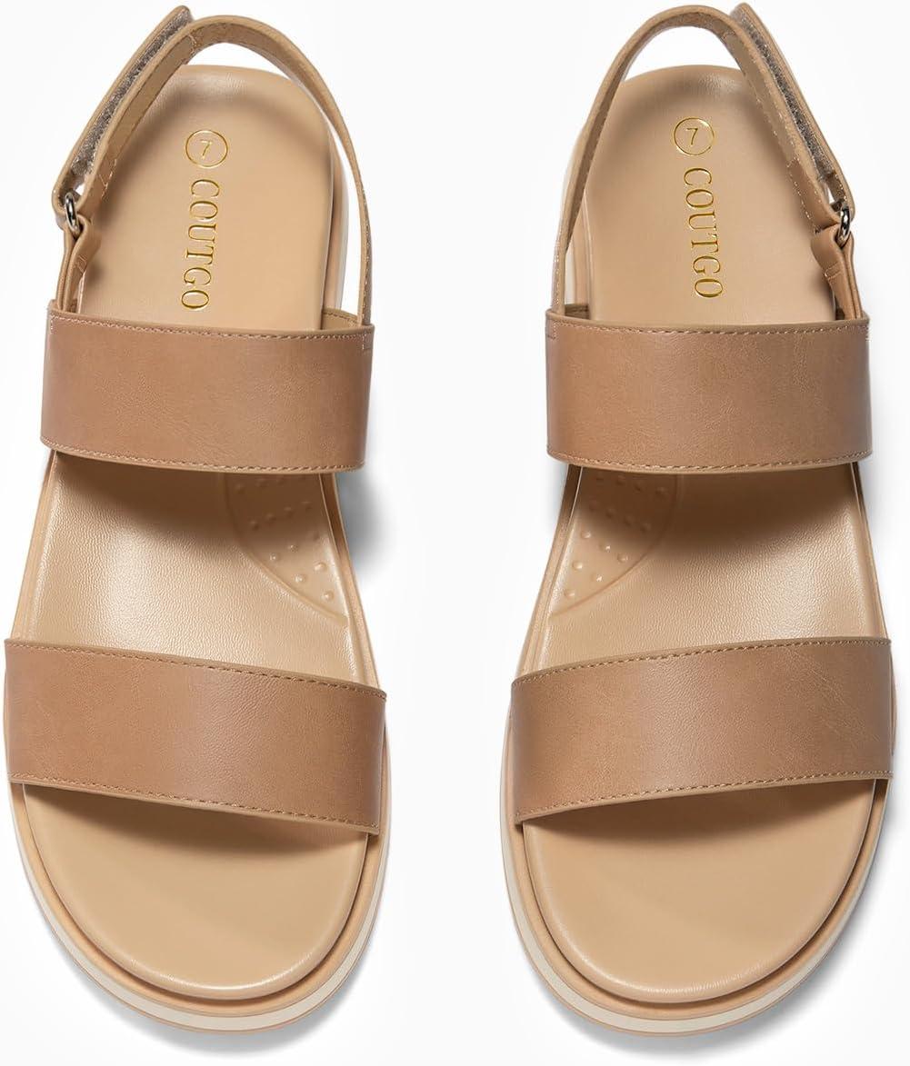 Coutgo Womens Flat Sandals Comfortable Arch Support Adjustable Double Strap Lightweight Summer Platform Sandals(Almond)