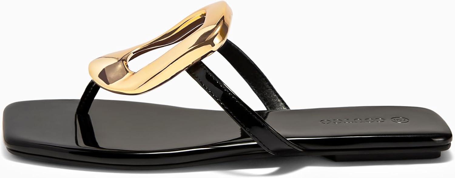 Coutgo Womens Flat Sandals Comfortable Flip Flops Slide Sandals Summer Beach Shoes with Metal Decoration(Black)