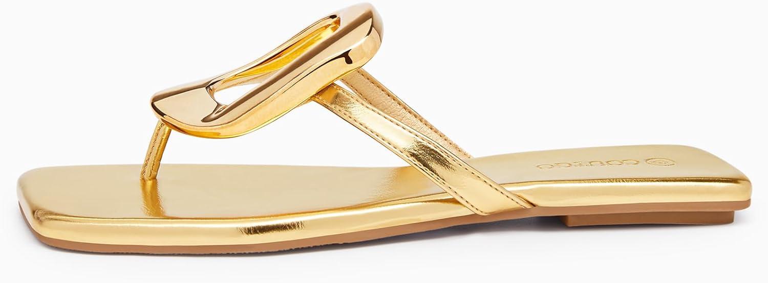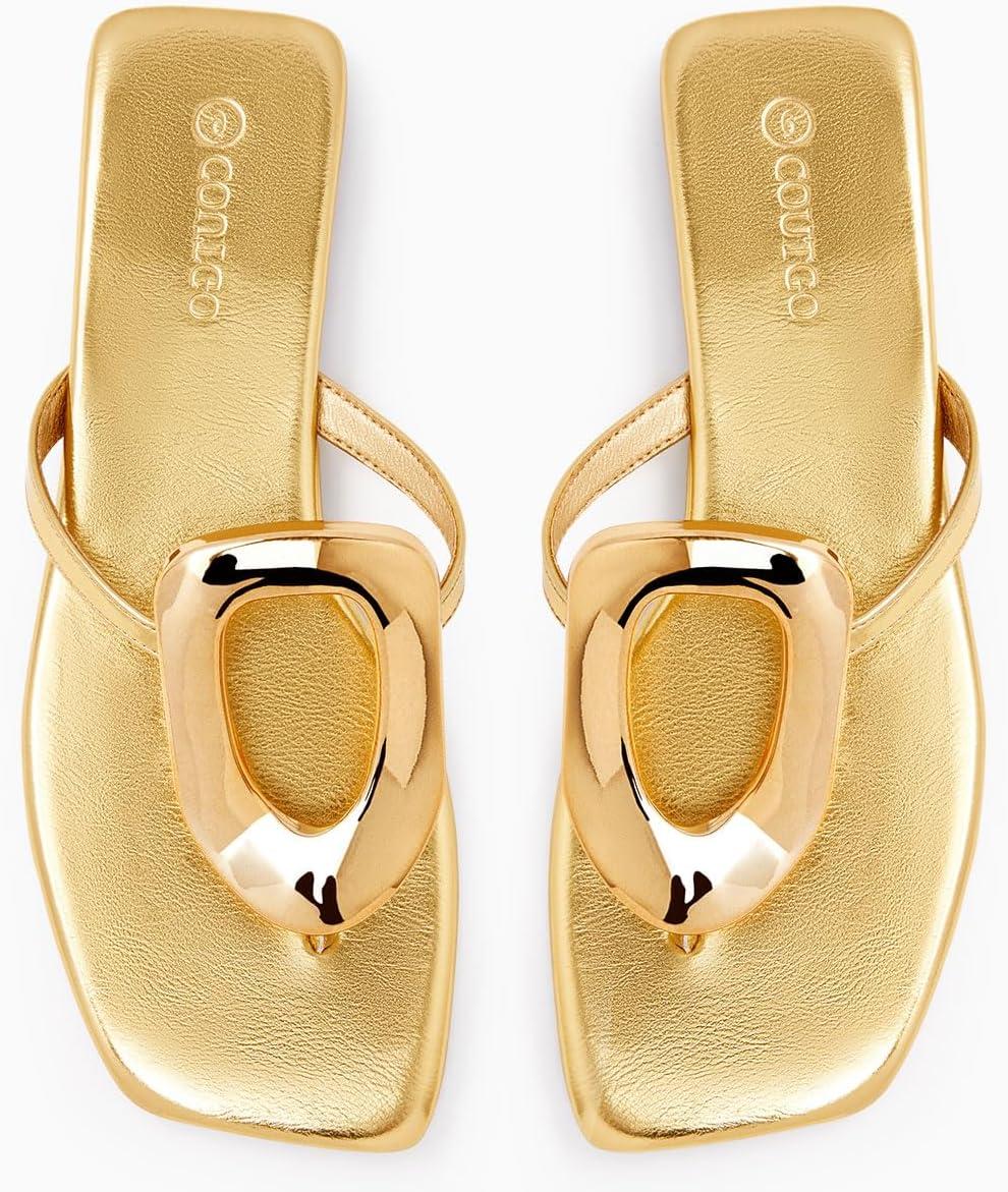 Coutgo Womens Flat Sandals Comfortable Flip Flops Slide Sandals Summer Beach Shoes with Metal Decoration(Gold)