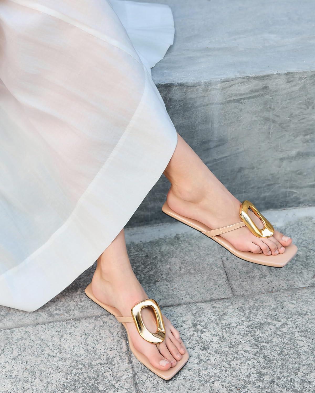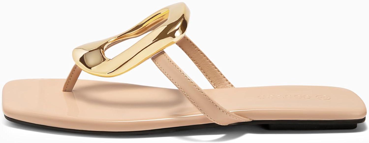 Coutgo Womens Flat Sandals Comfortable Flip Flops Slide Sandals Summer Beach Shoes with Metal Decoration(Nude)