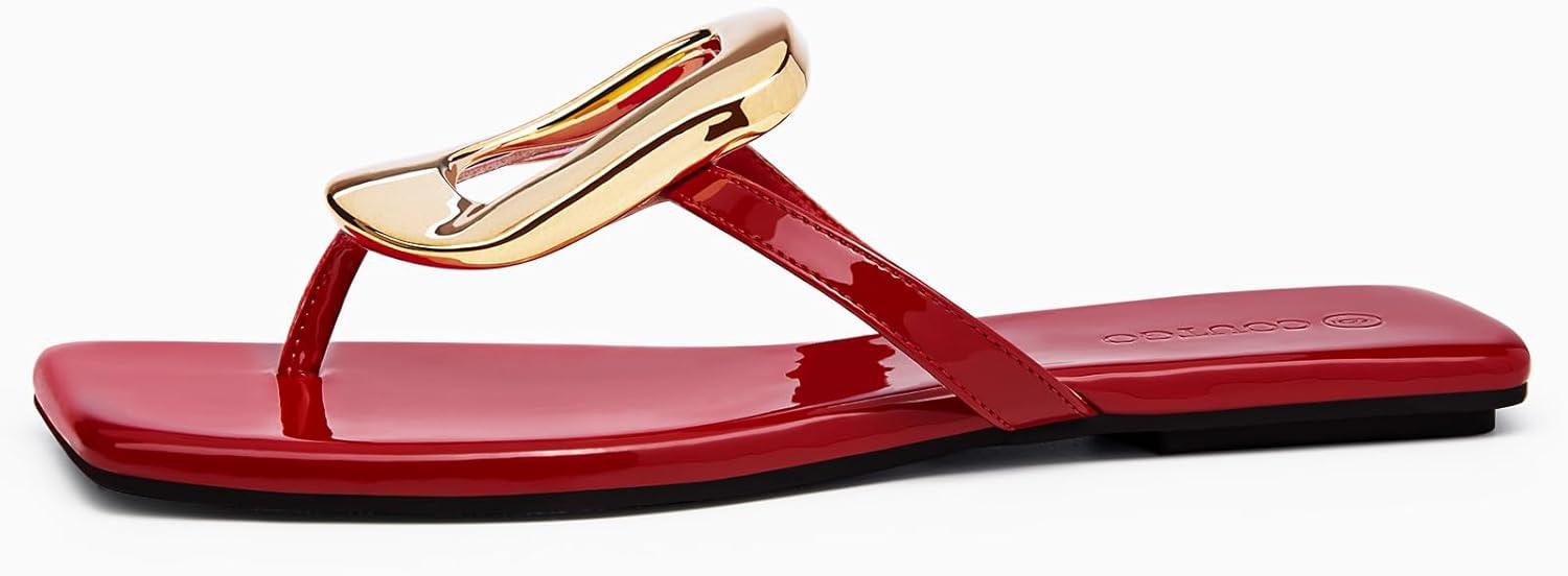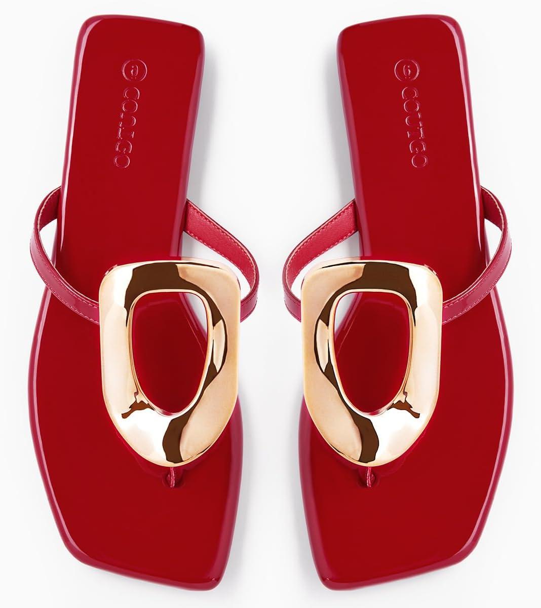 Coutgo Womens Flat Sandals Comfortable Flip Flops Slide Sandals Summer Beach Shoes with Metal Decoration(Red)