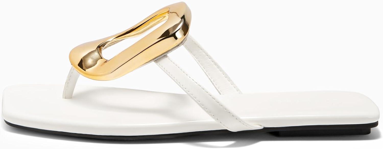 Coutgo Womens Flat Sandals Comfortable Flip Flops Slide Sandals Summer Beach Shoes with Metal Decoration(White)