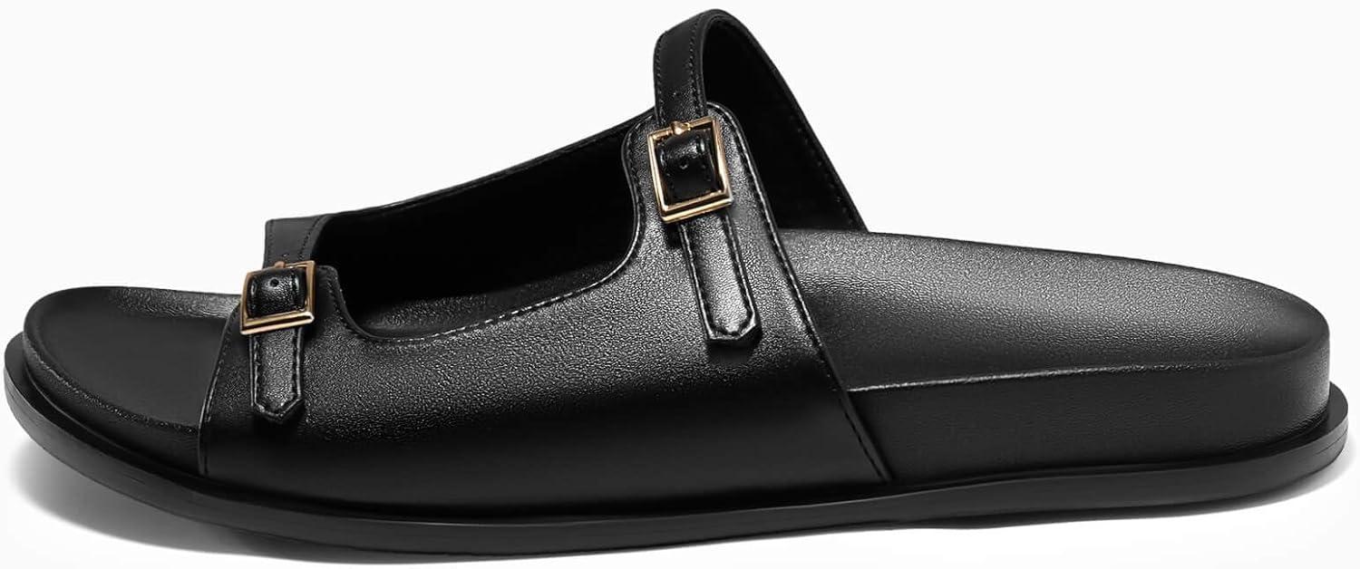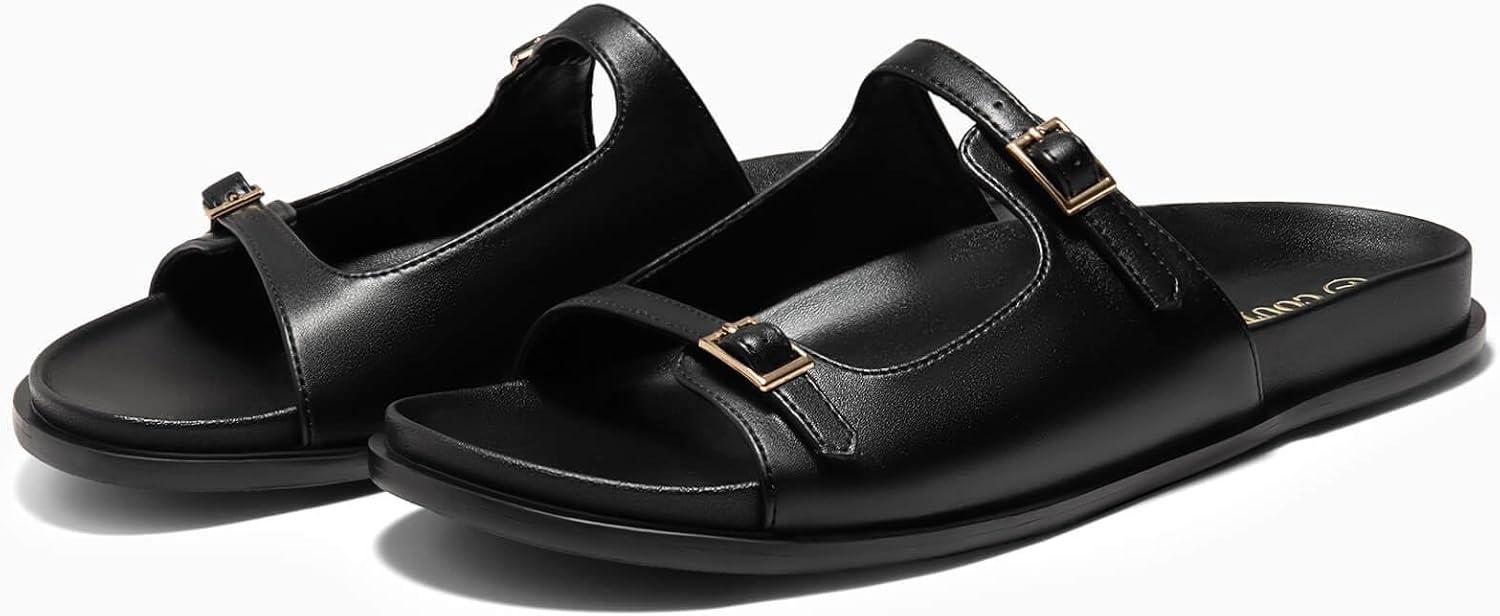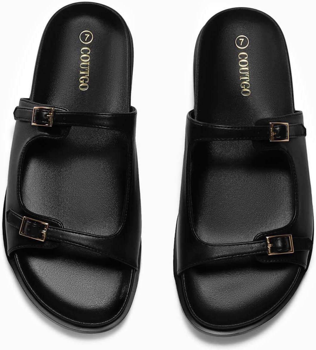 Coutgo Womens Flat Sandals Comfortable Wide Width Slides Double Strap Adjustable Buckle Slip on Shoes(Black)