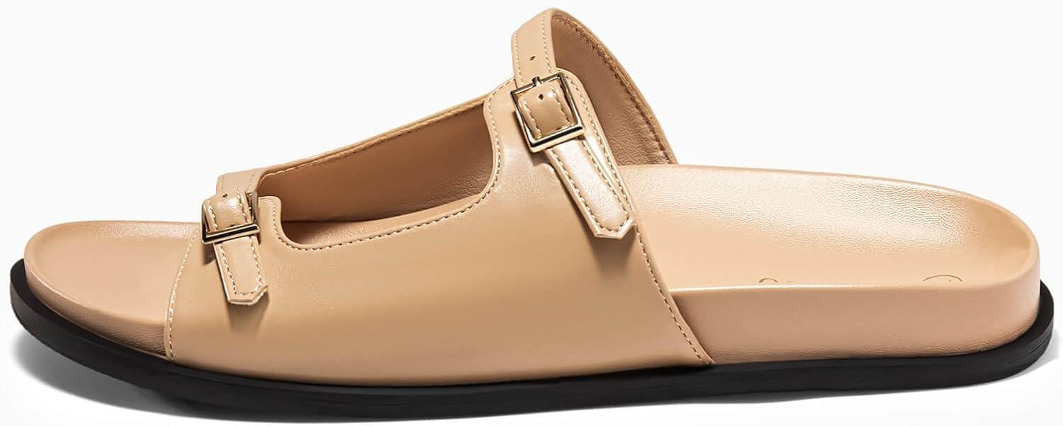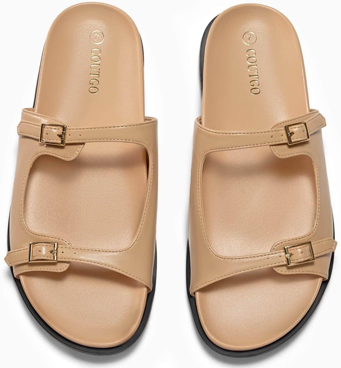 Coutgo Womens Flat Sandals Comfortable Wide Width Slides Double Strap Adjustable Buckle Slip on Shoes(Camel)
