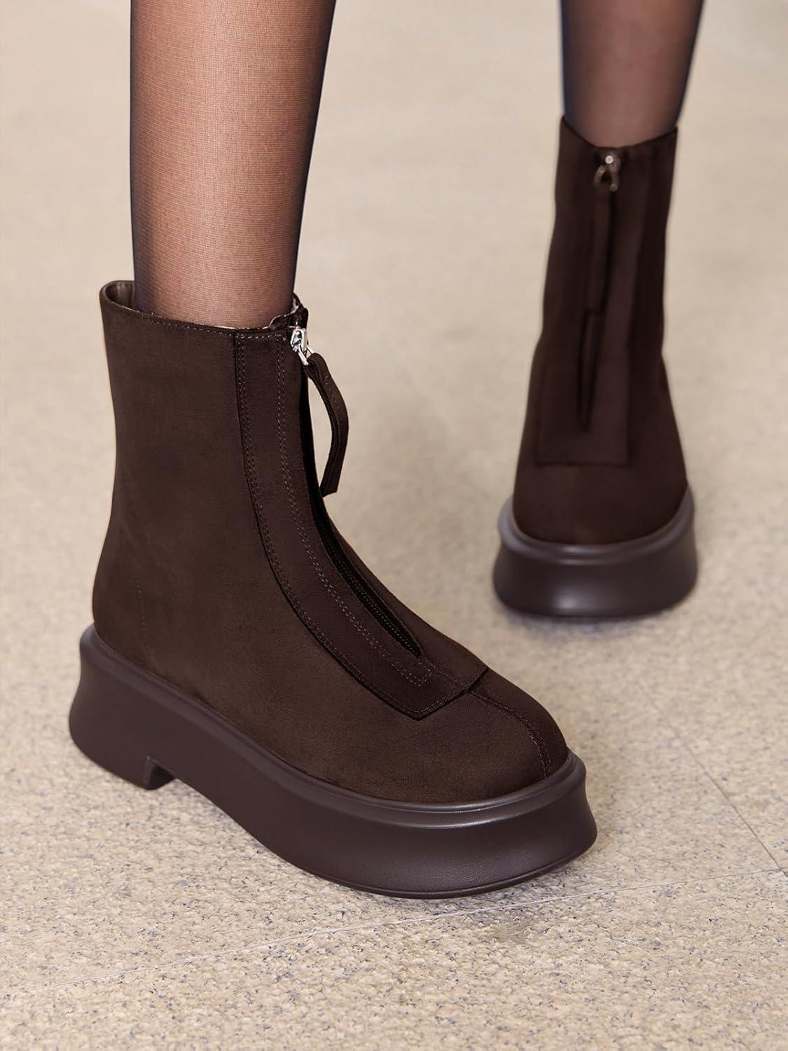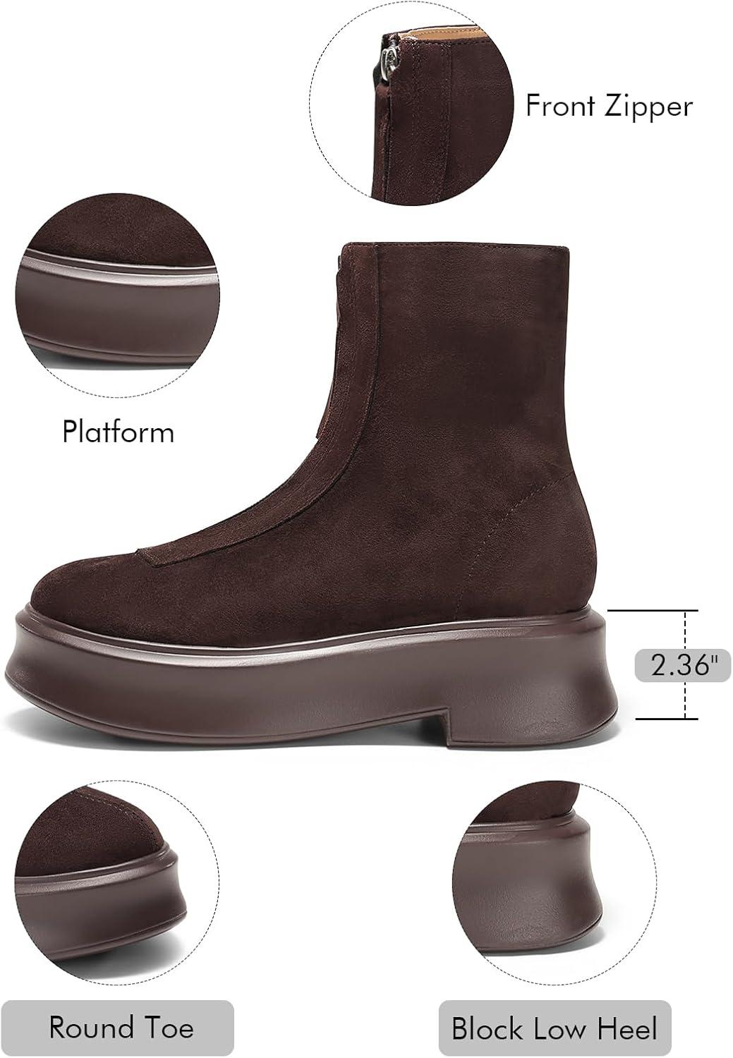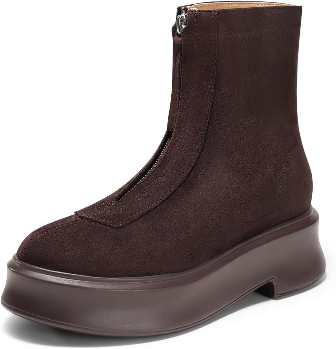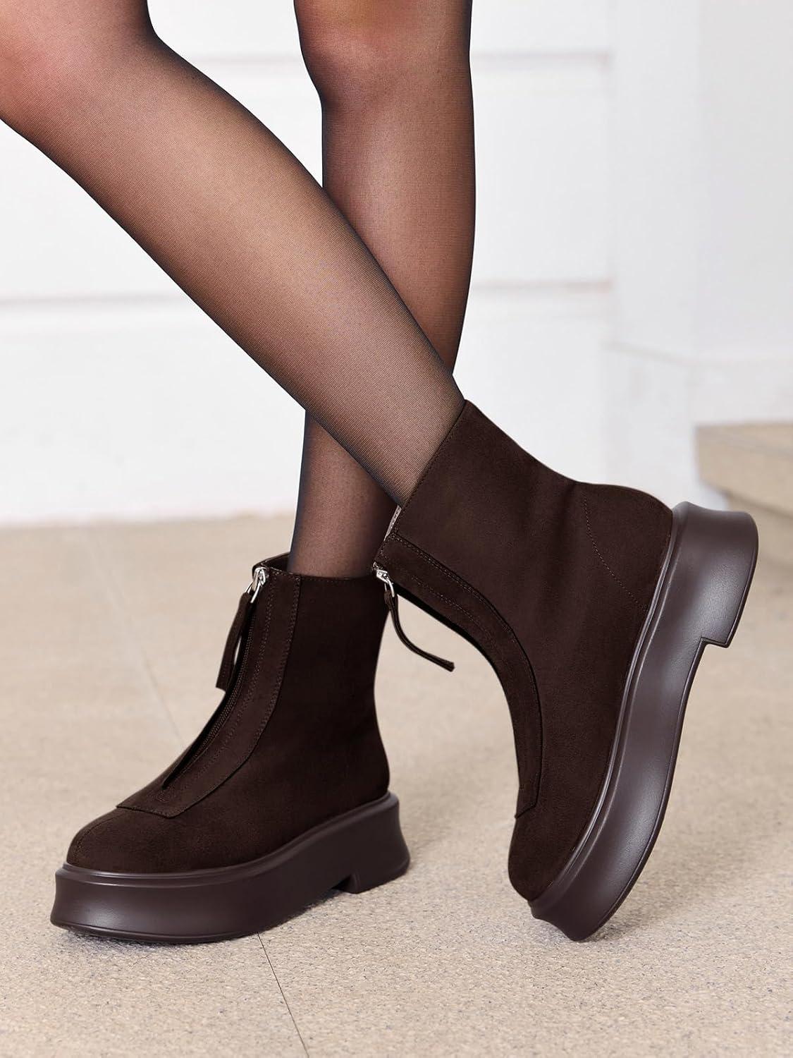 Coutgo Womens Front Zip Ankle Boots Comfortable Platform Flat Chunky Heel Booties Round Toe Casual Winter Snow Boots(Chocolate)