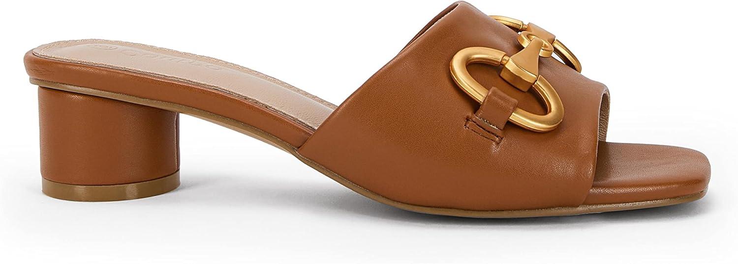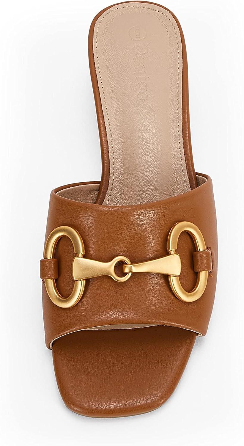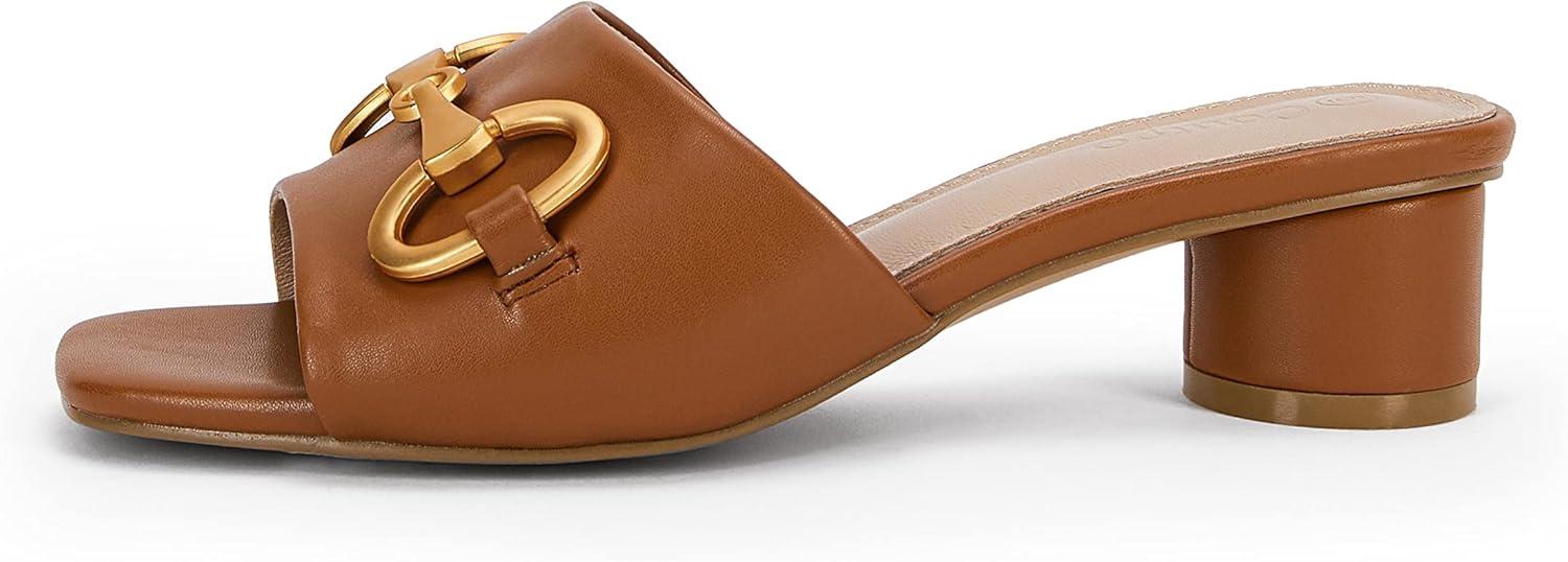 Coutgo Womens Heeled Slides Sandals Square Open Toe Slip on Comfortable Mules Block Low Heel Metal Chain Dressy Shoes(Brown)