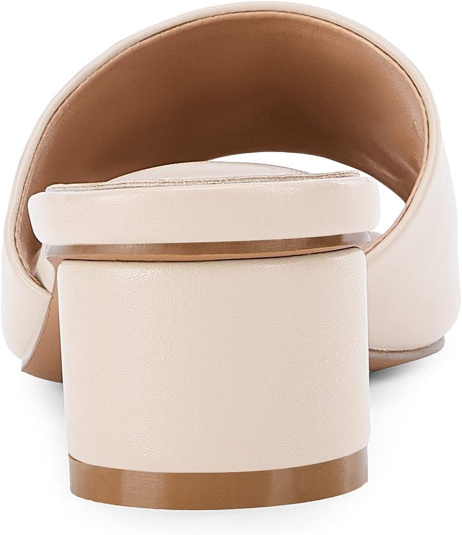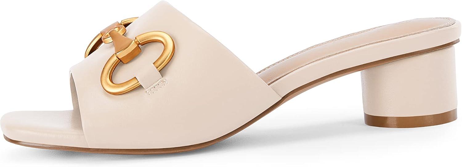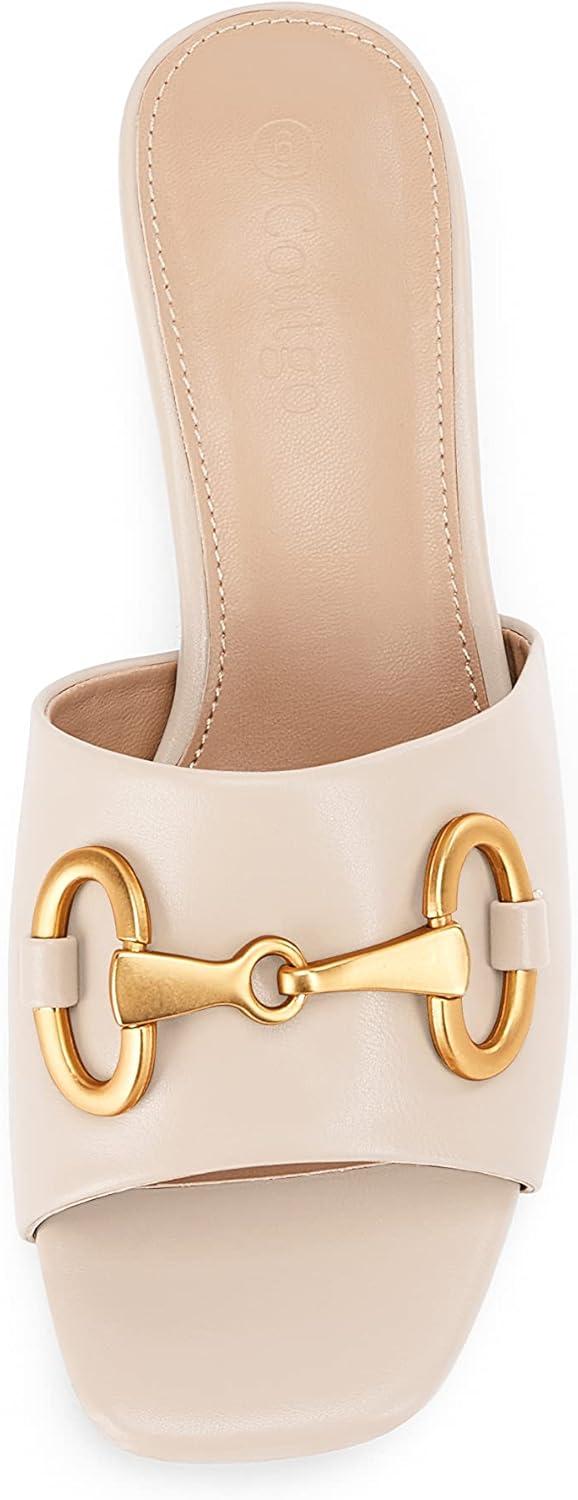 Coutgo Womens Heeled Slides Sandals Square Open Toe Slip on Comfortable Mules Block Low Heel Metal Chain Dressy Shoes(Nude)