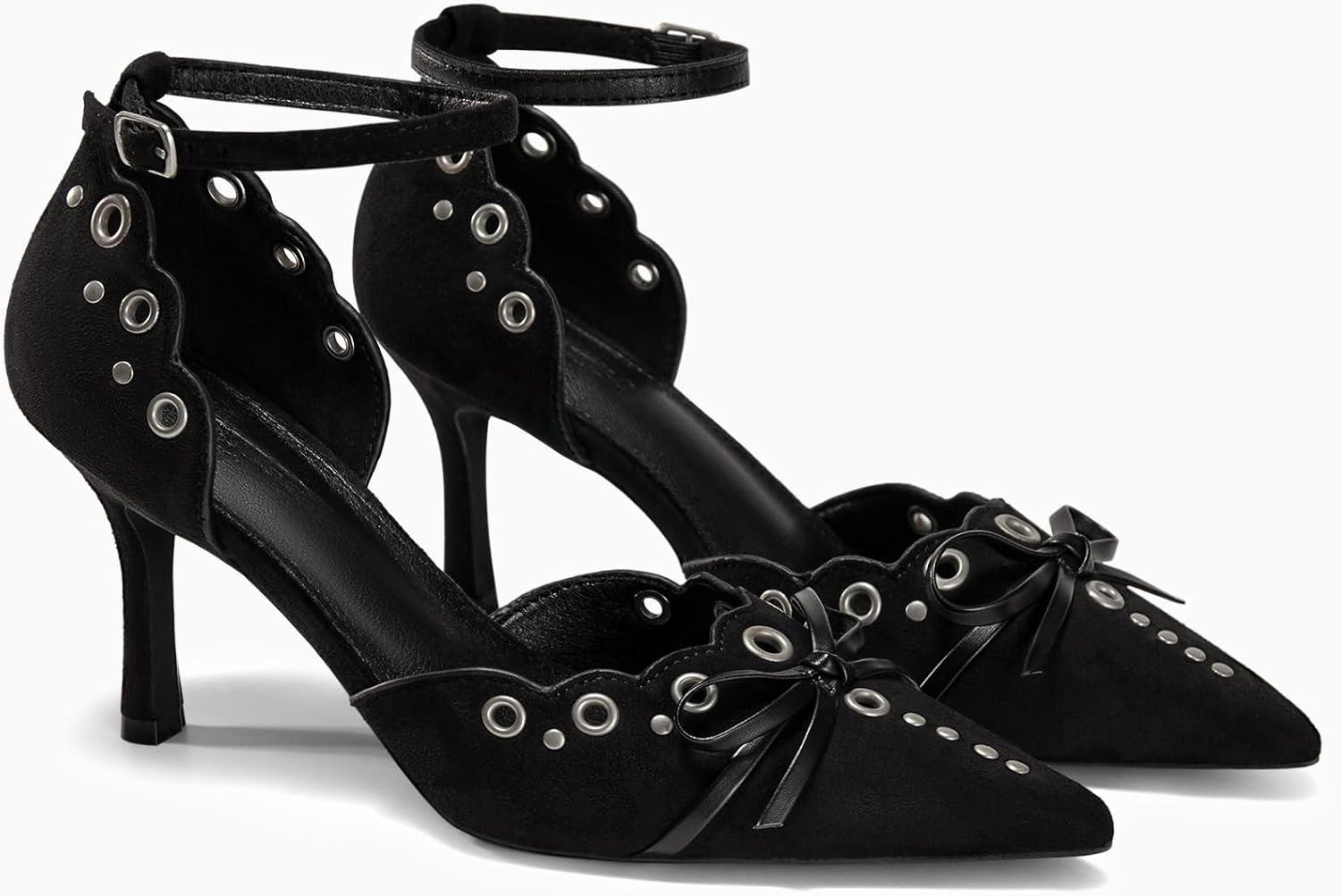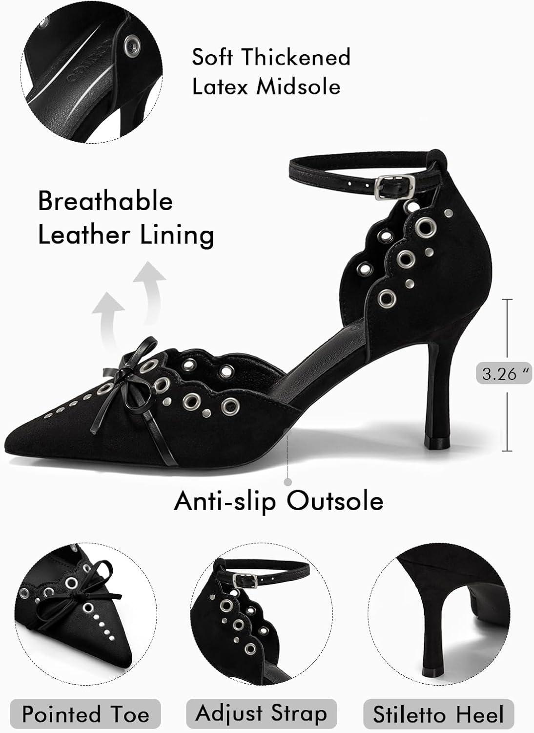 Coutgo Womens High Heels Bow Tie Closed Pointed Toe Stiletto Ankle Strap Studded Suede Dress Shoes(Black)