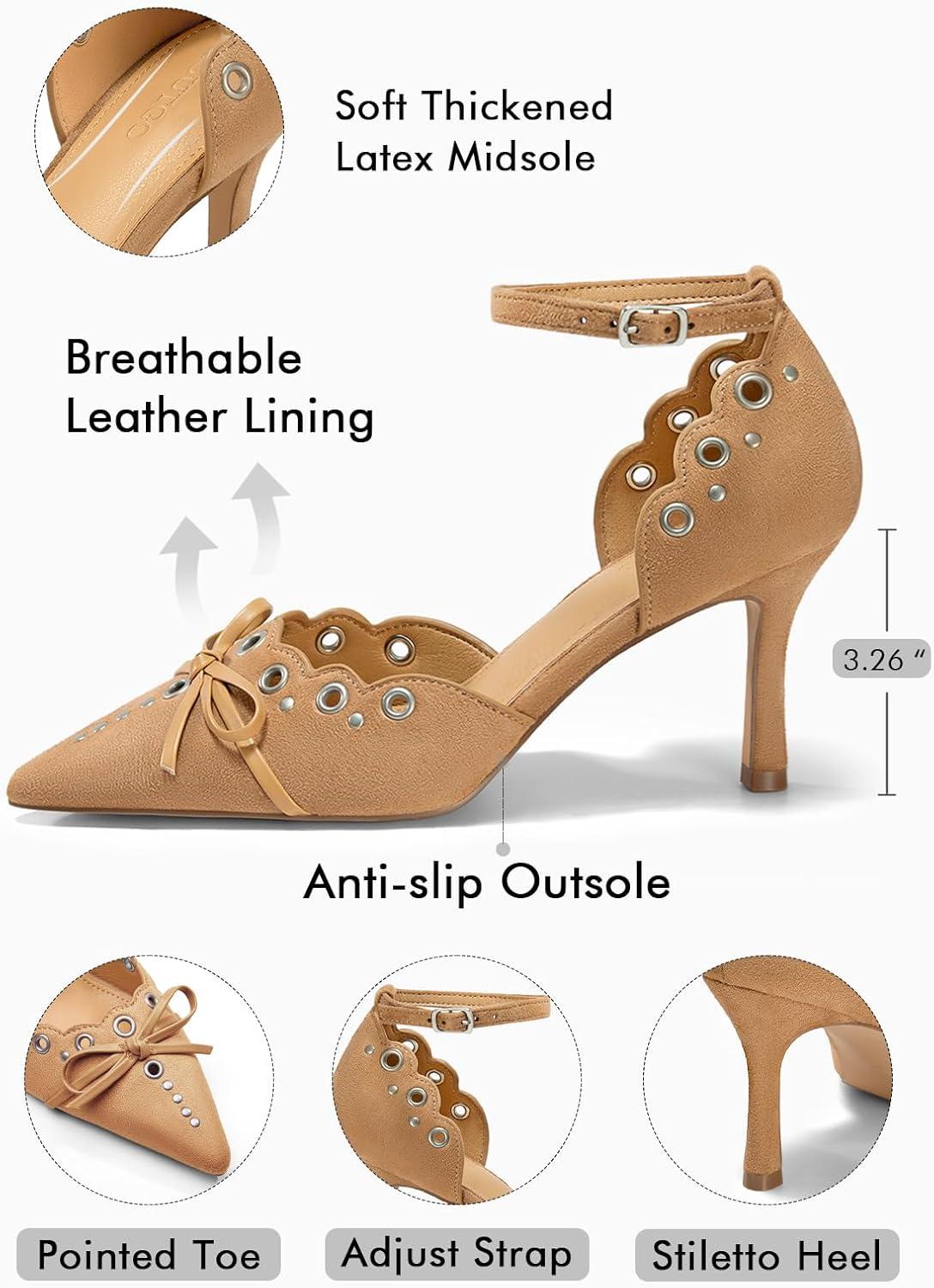 Get the Coutgo Womens High Heels Bow Tie Closed Pointed Toe Stiletto Ankle Strap Studded Suede Dress Shoes(Khaki) you want at a price you can afford with our markdown sale.