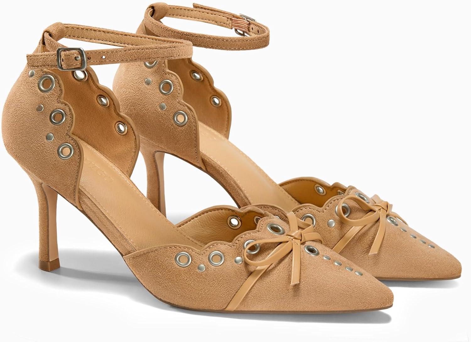 Coutgo Womens High Heels Bow Tie Closed Pointed Toe Stiletto Ankle Strap Studded Suede Dress Shoes(Khaki)