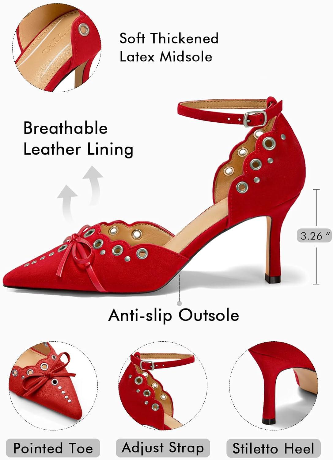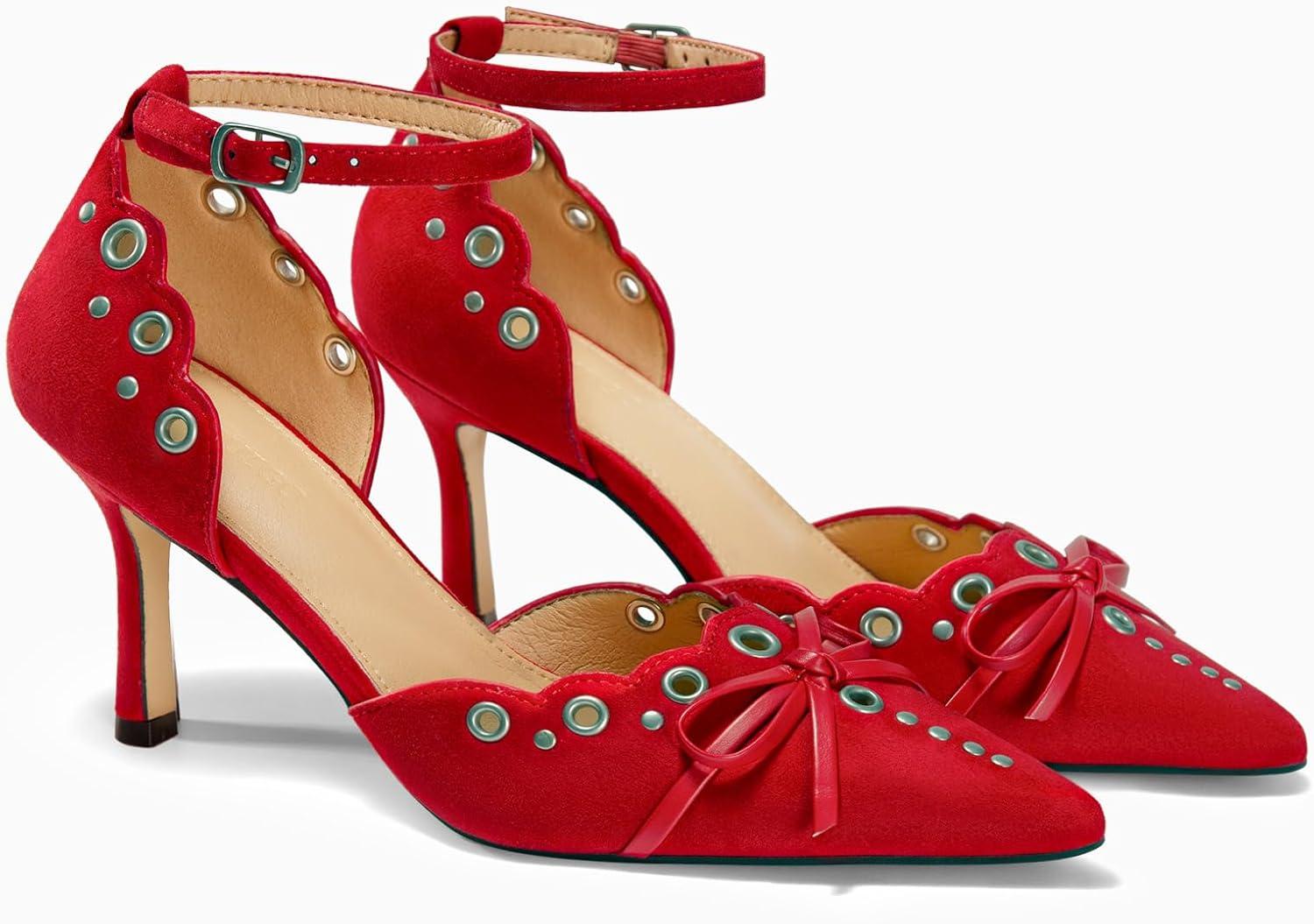 Coutgo Womens High Heels Bow Tie Closed Pointed Toe Stiletto Ankle Strap Studded Suede Dress Shoes(Red)
