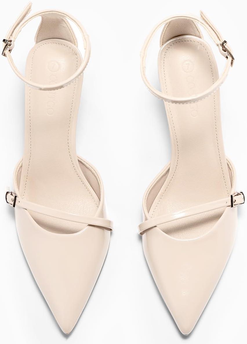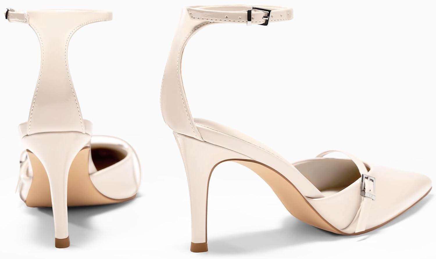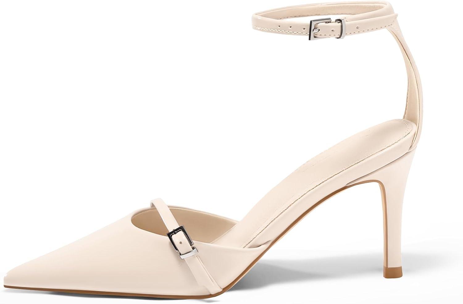 Coutgo Womens High Heels Closed Pointed Toe Ankle Buckle Strap Sexy Pumps Wedding Party Dress Shoes(Beige)