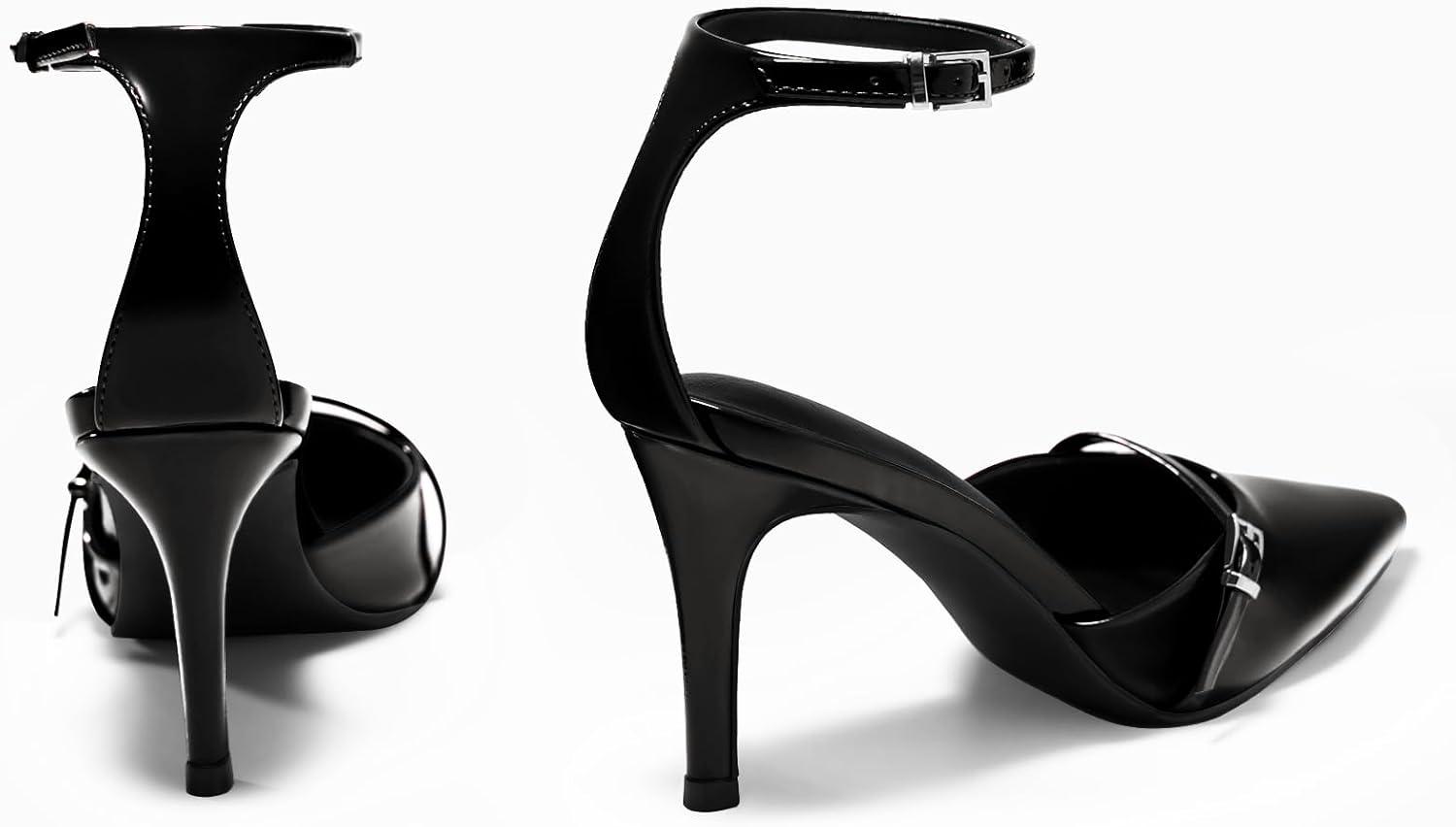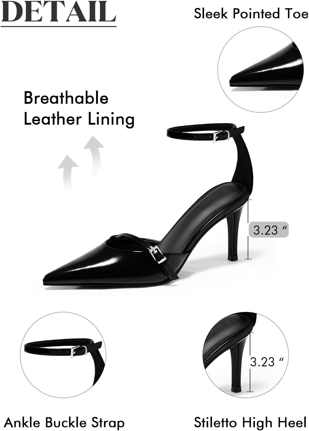 Coutgo Womens High Heels Closed Pointed Toe Ankle Buckle Strap Sexy Pumps Wedding Party Dress Shoes(Black)