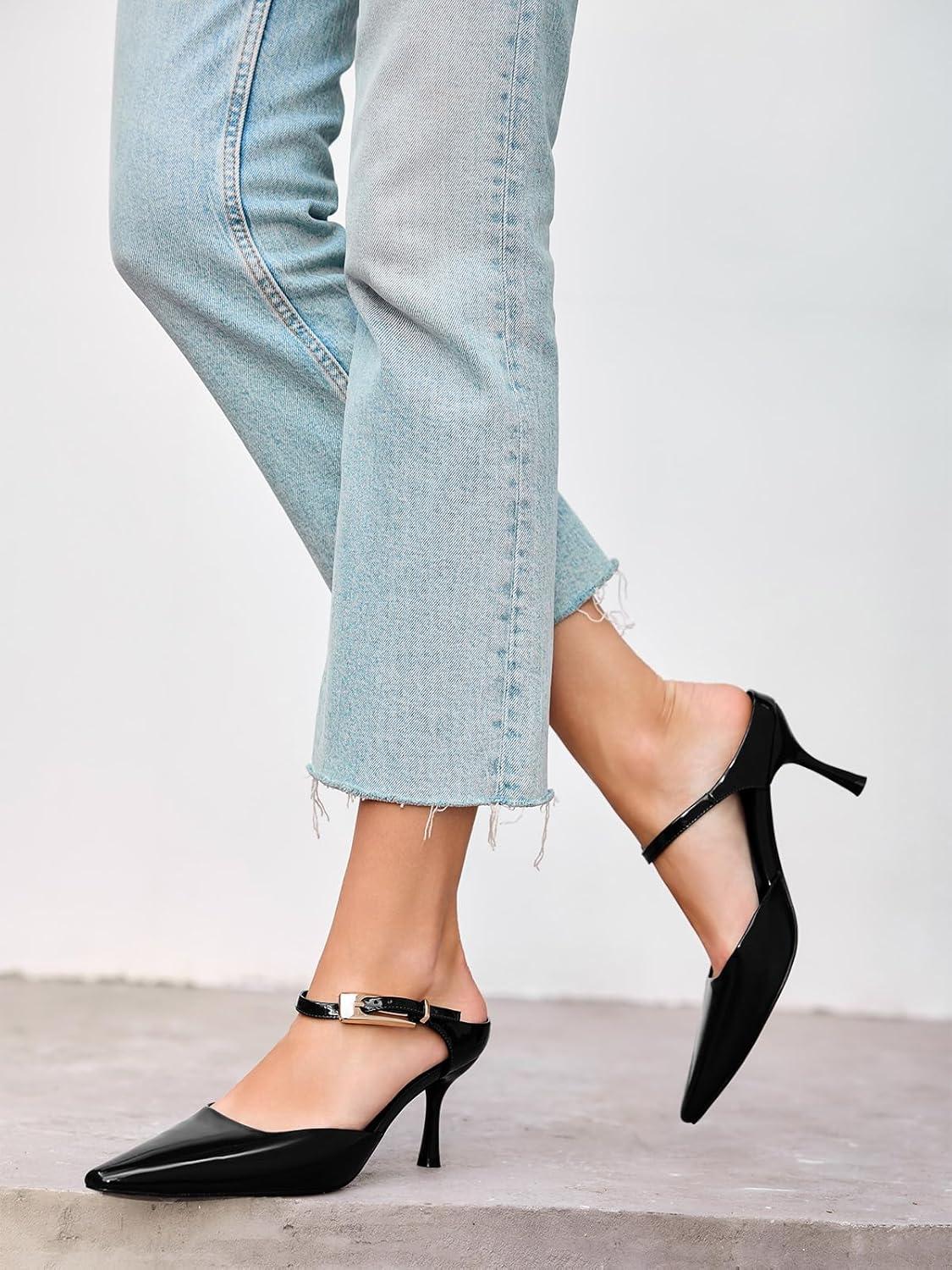 Coutgo Womens High Heels Mules Closed Pointed Toe Kitten Heel Pumps Ankle Buckle Strap Slip On Backless Dress Shoes(Black)