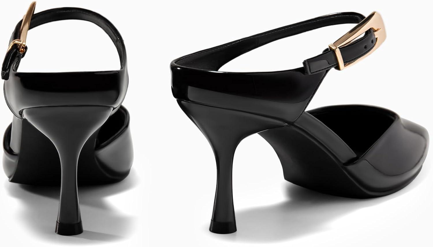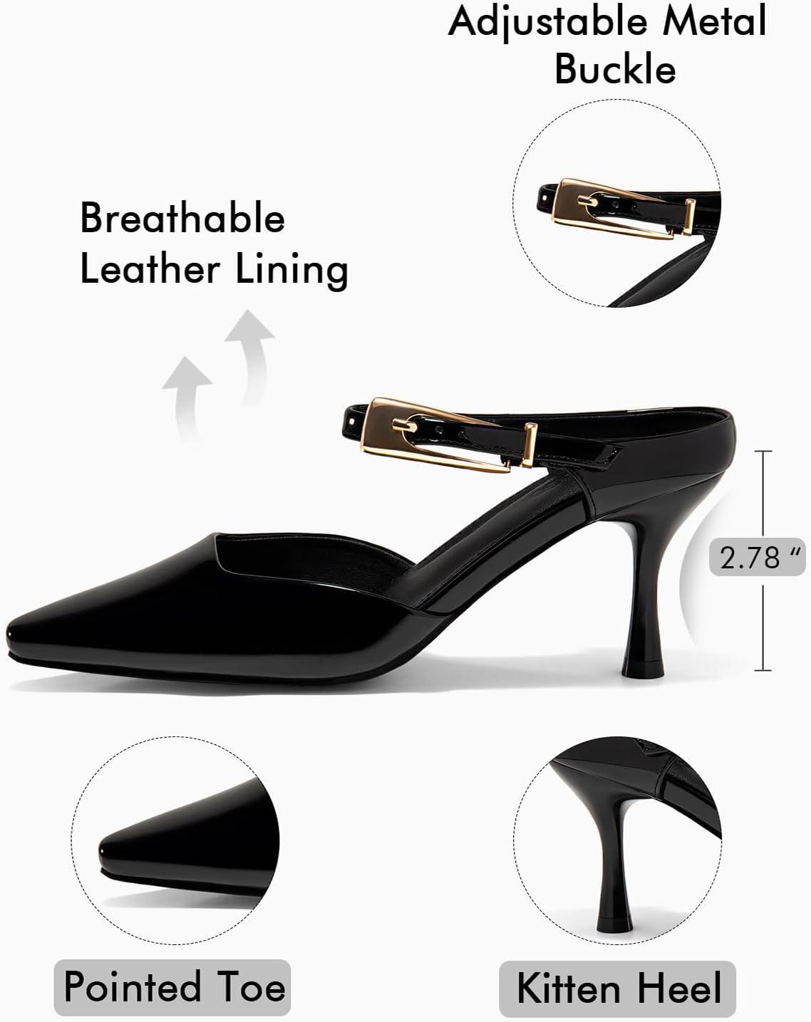 women's pointed toe heeled mules sandals, premium faux leather, comfortable kitten heel, exquisite buckle strap, soft cushioning insole, non-slip rubber sole.