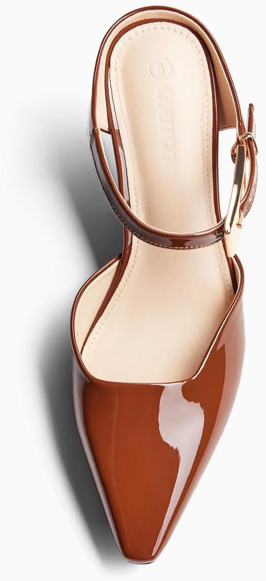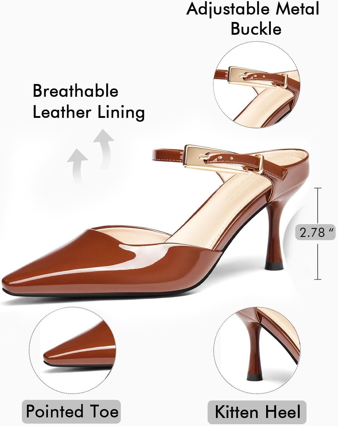 Get up to 60% off on Coutgo Womens High Heels Mules Closed Pointed Toe Kitten Heel Pumps Ankle Buckle Strap Slip On Backless Dress Shoes(Brown) styles during our winter sale event.