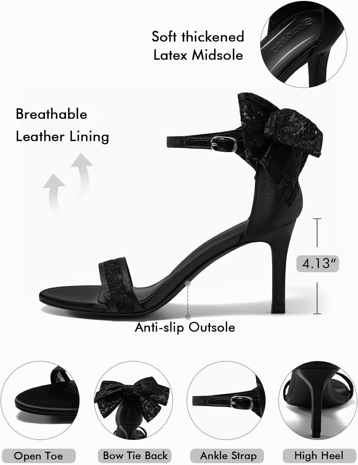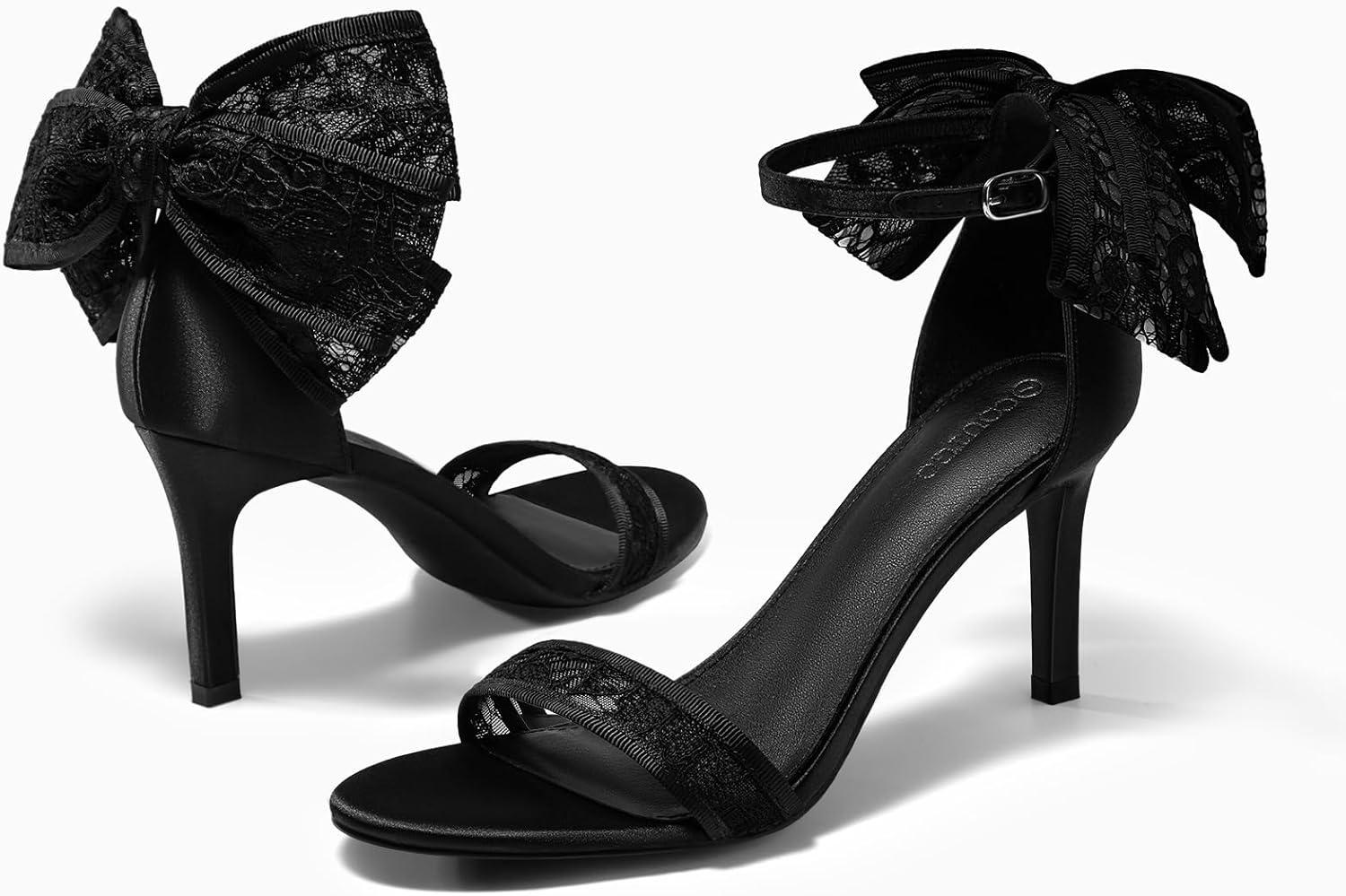 Coutgo Womens High Heels Sandals Lace Bow Tie Back Open Toe Ankle Strap Sexy Stiletto Wedding Party Dress Shoes(Black)