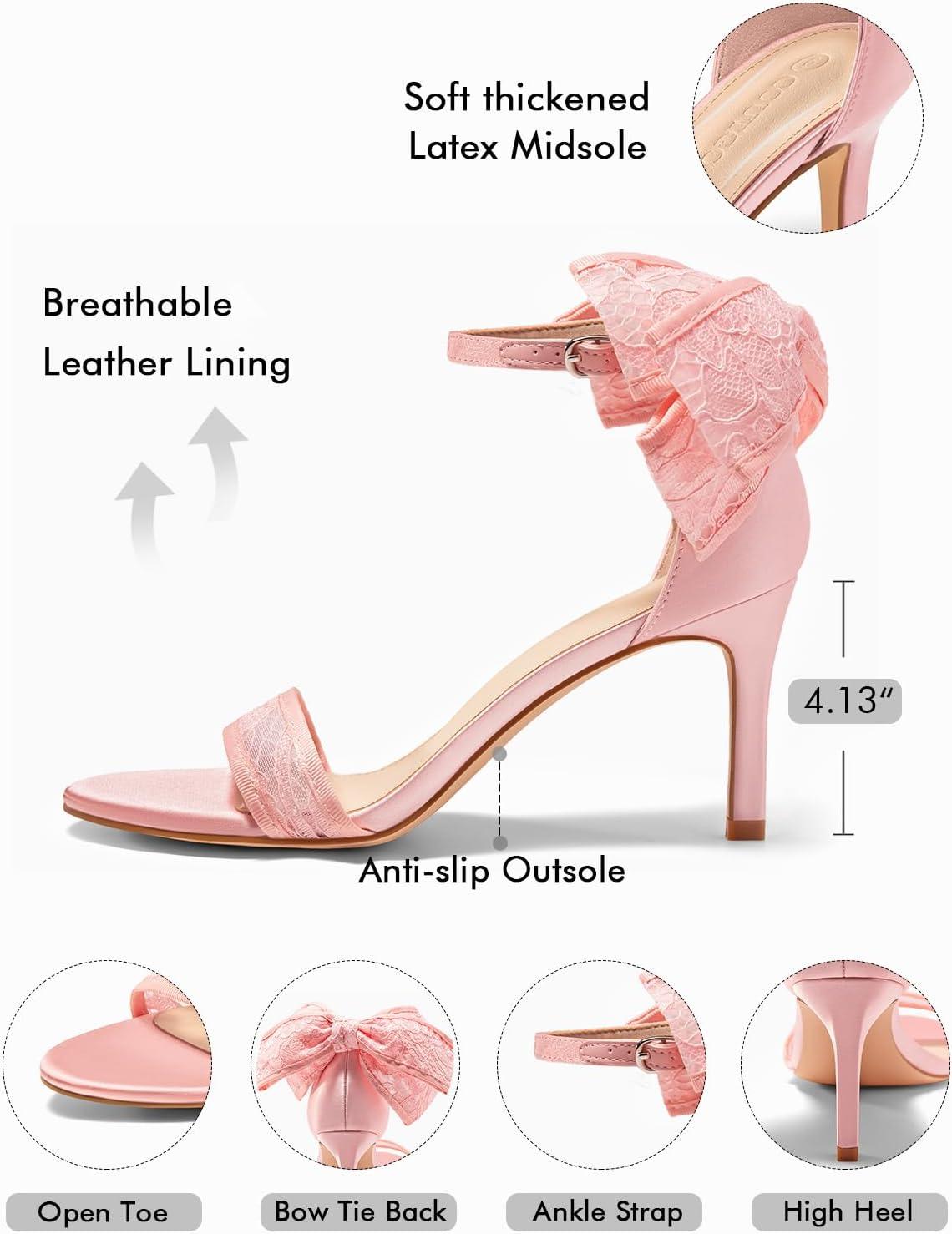 Coutgo Womens High Heels Sandals Lace Bow Tie Back Open Toe Ankle Strap Sexy Stiletto Wedding Party Dress Shoes(Pink)