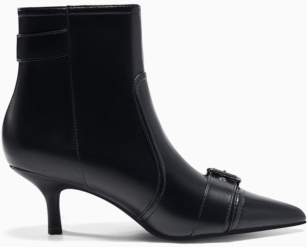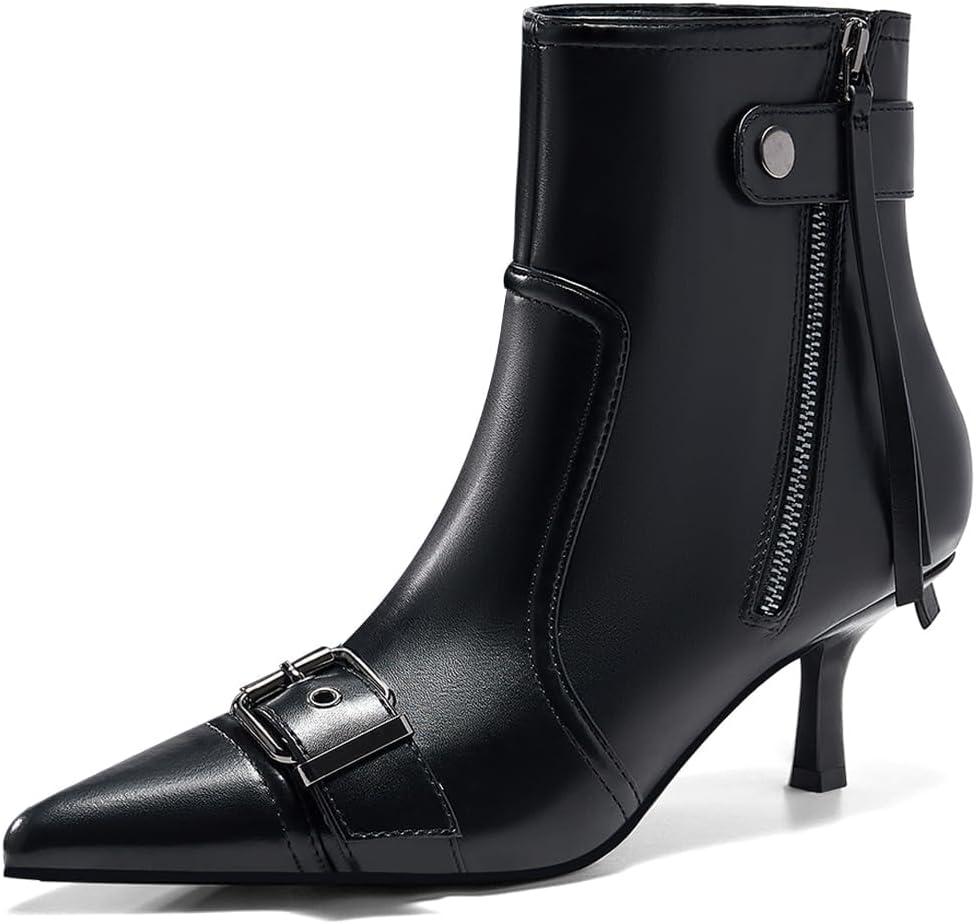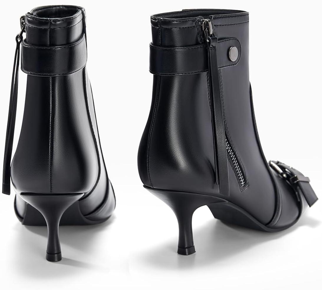 Coutgo Womens Kitten Heel Ankle Boots Pointed Toe Buckle Side Zipper Tassel Fall Winter Booties Shoes(Black)