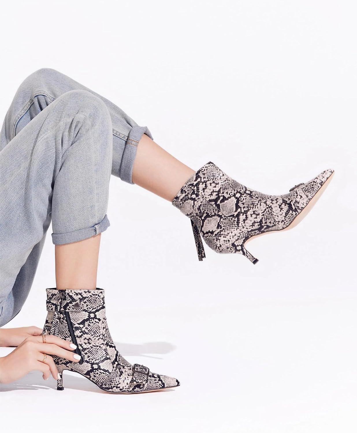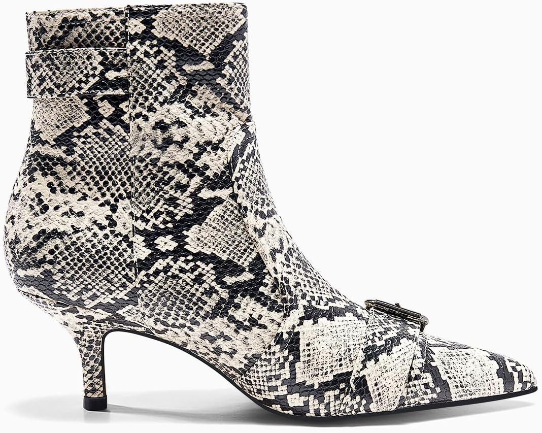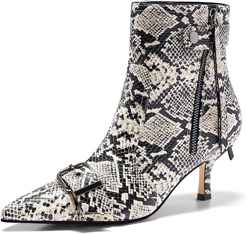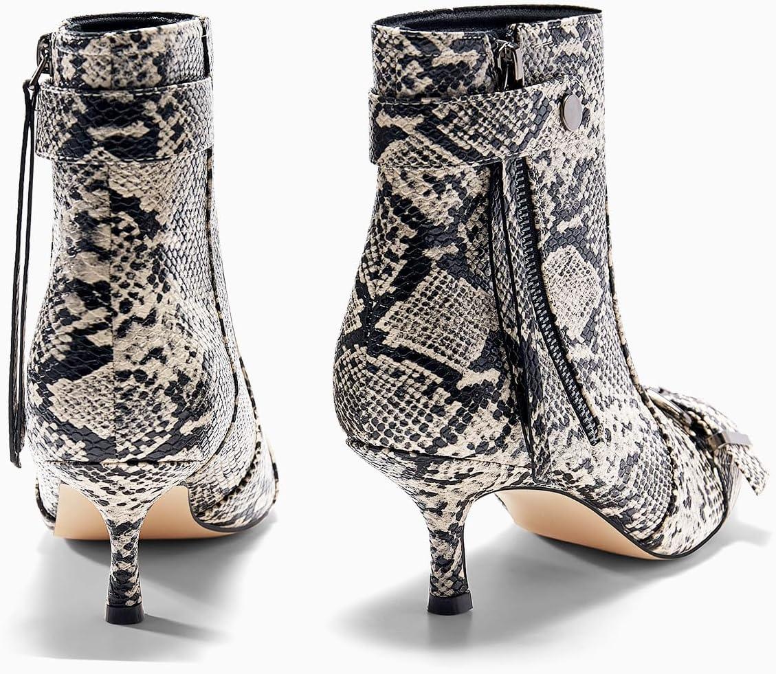 Coutgo Womens Kitten Heel Ankle Boots Pointed Toe Buckle Side Zipper Tassel Fall Winter Booties Shoes(Snake Skin)