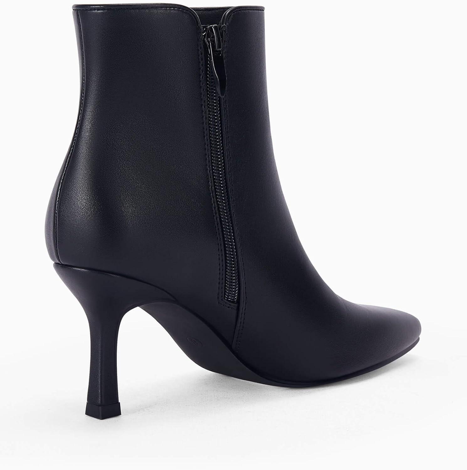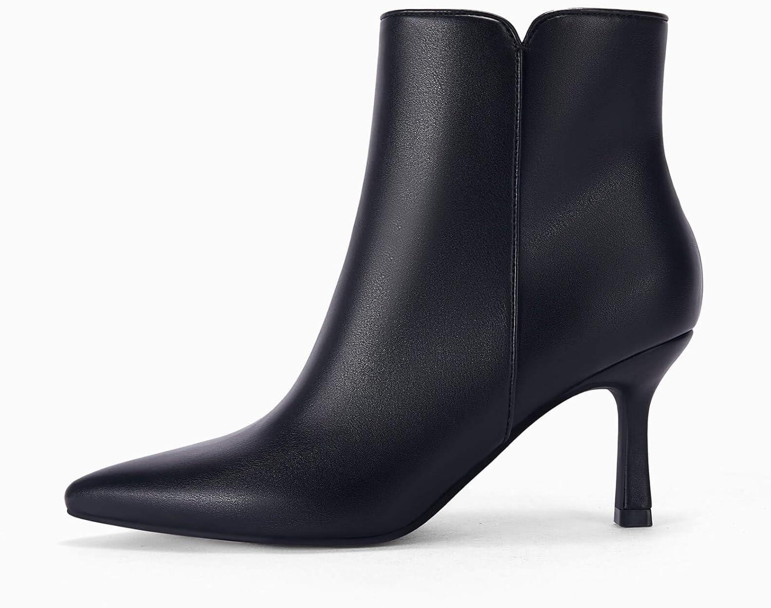 Coutgo Women’s Kitten Heel Booties Pointed Toe Low Stiletto Side Zipper Ankle Boots Shoes(Leather Black)
