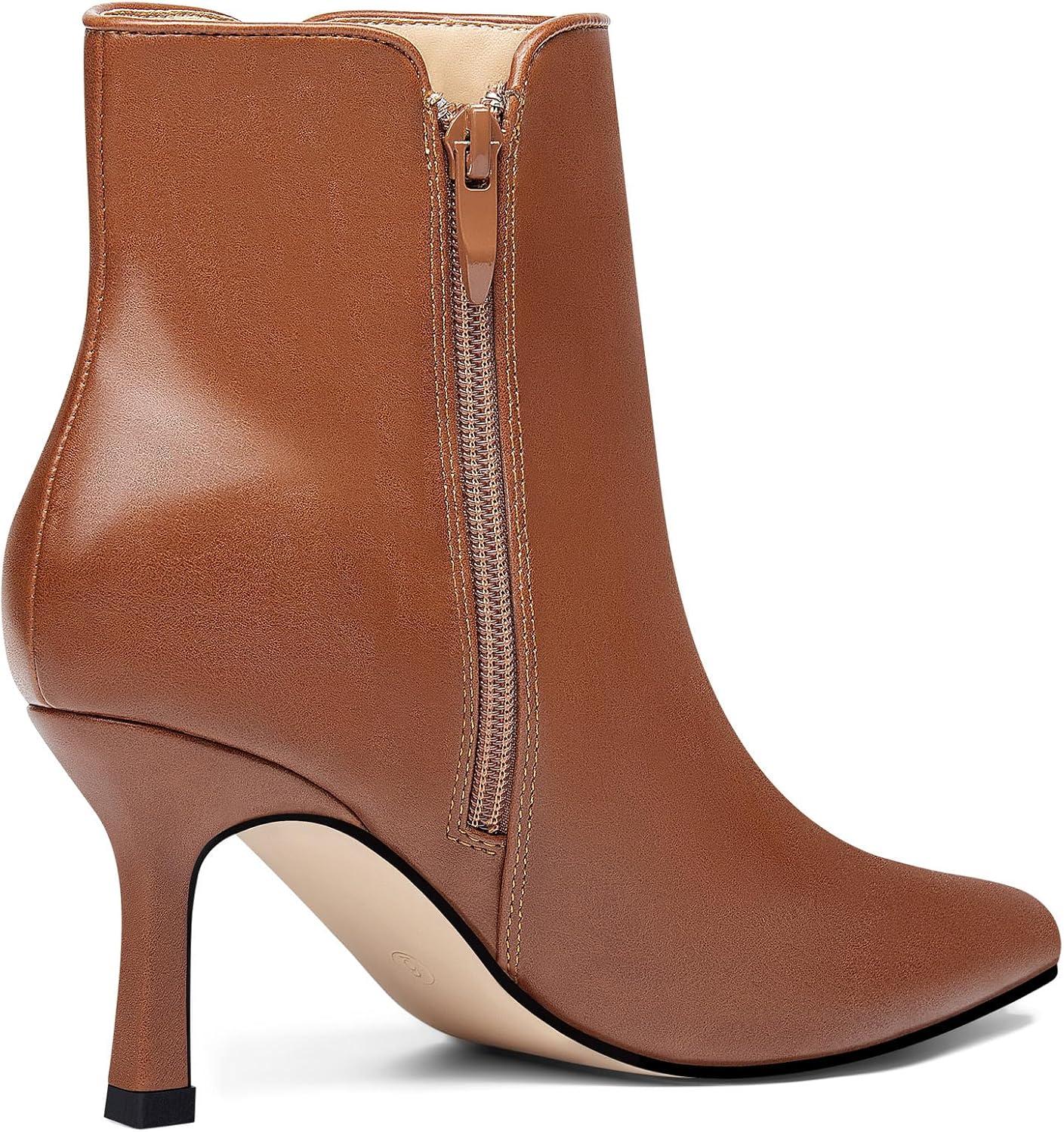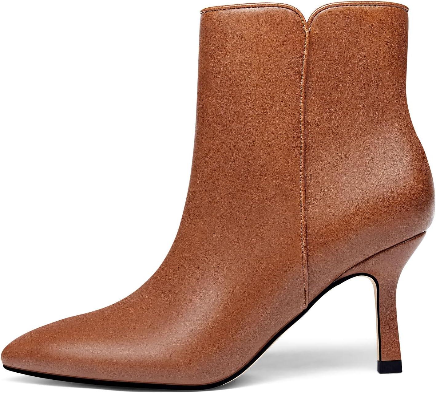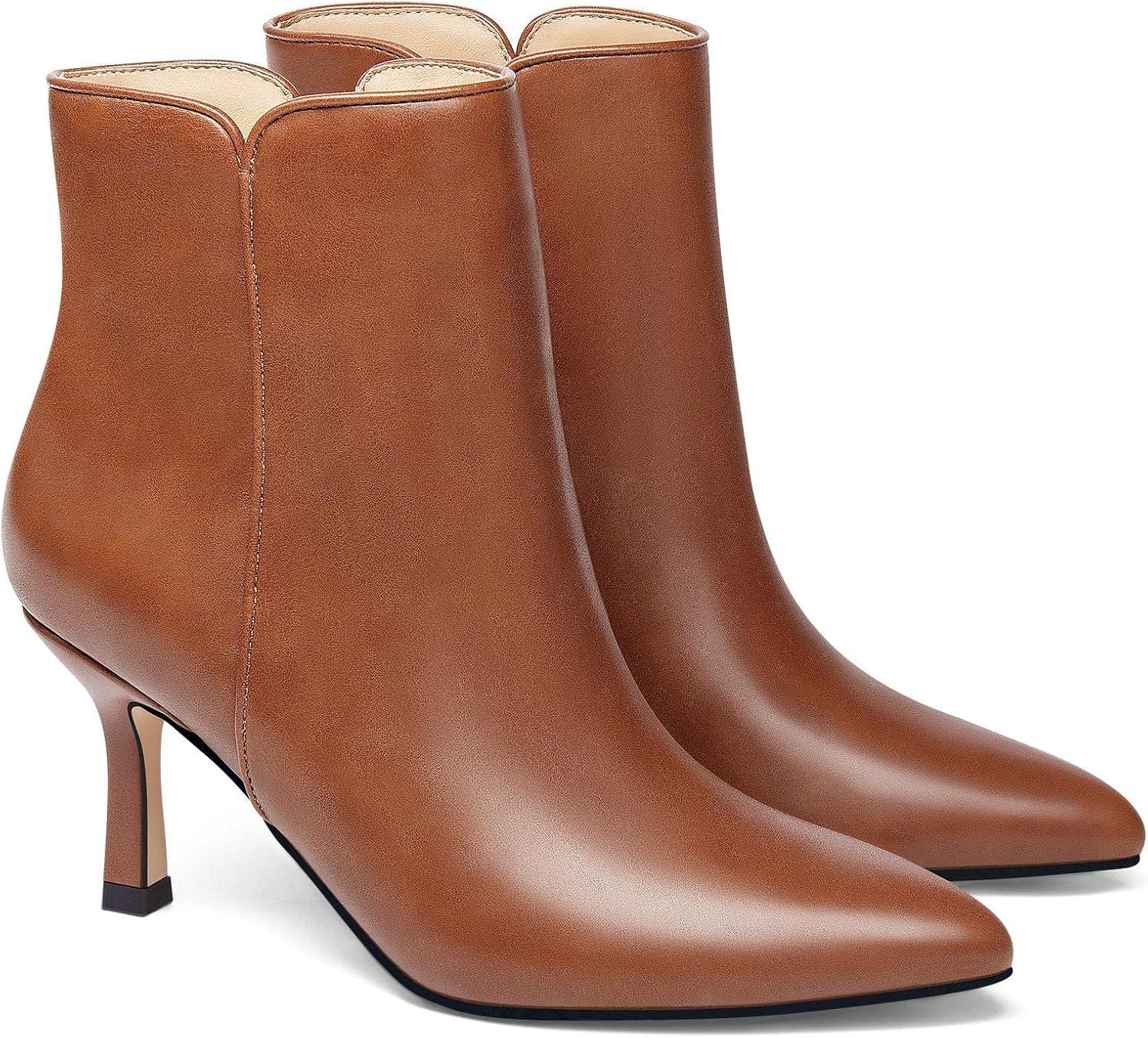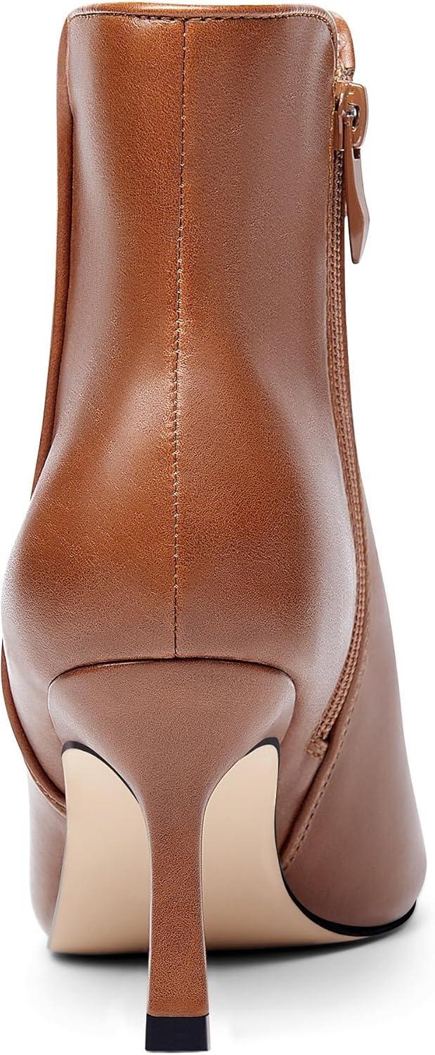 Coutgo Women’s Kitten Heel Booties Pointed Toe Low Stiletto Side Zipper Ankle Boots Shoes(Leather Red-brown)