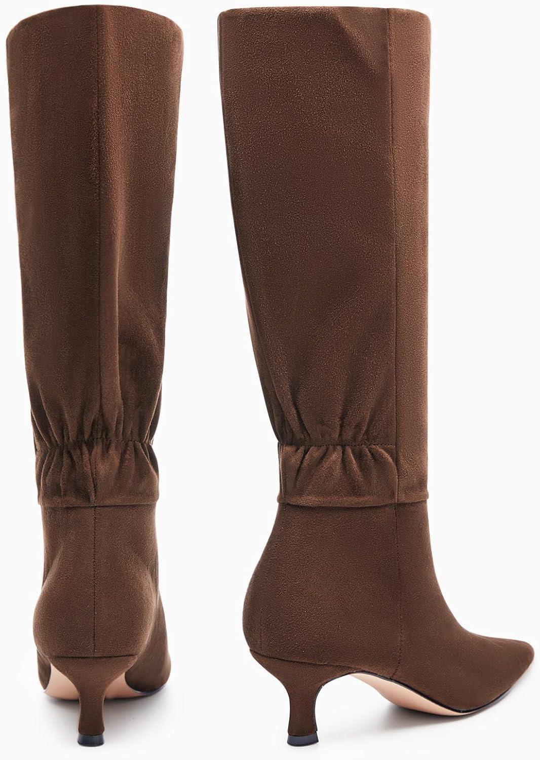 Coutgo Womens Kitten Heel Knee High Boots Pointed Toe Tall Boots Pull On Winter Dress Long Boot Shoes(Dark Brown(suede))