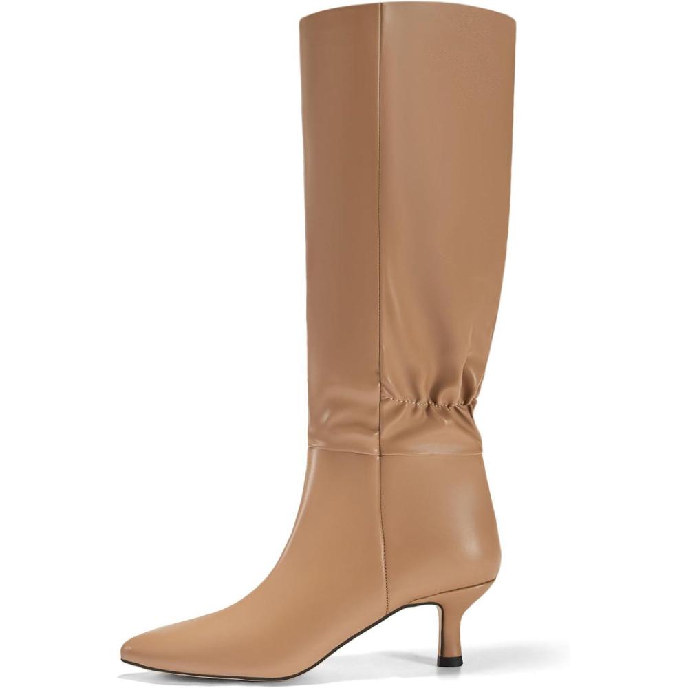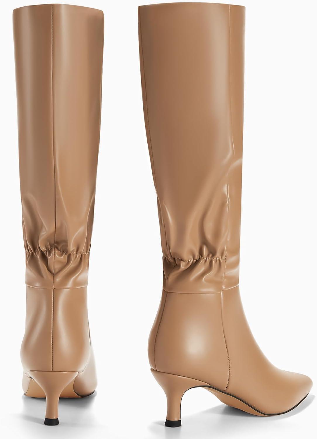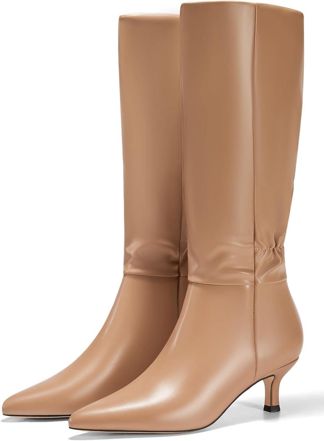 Coutgo Womens Kitten Heel Knee High Boots Pointed Toe Tall Boots Pull On Winter Dress Long Boot Shoes(Light Brown)